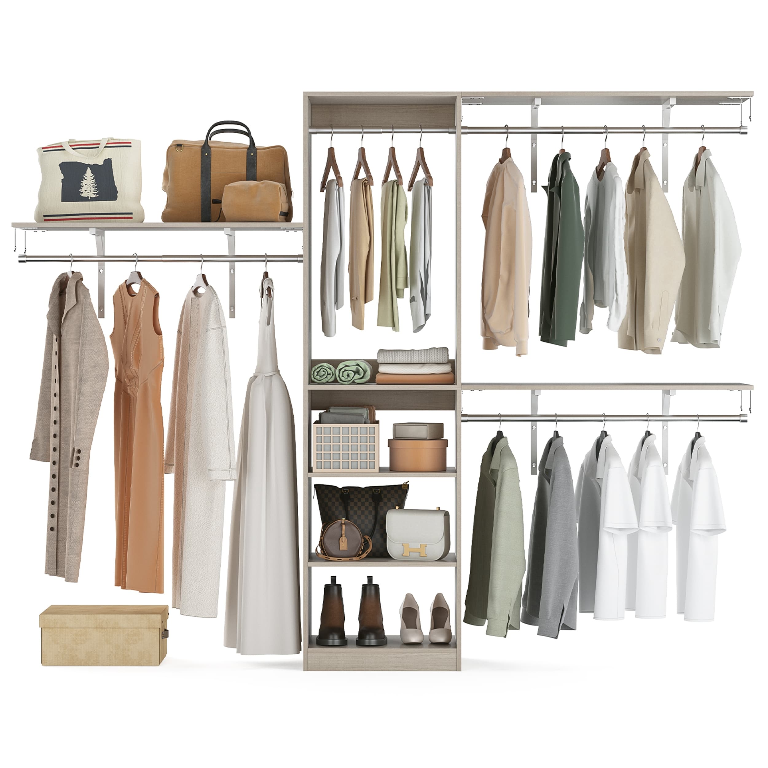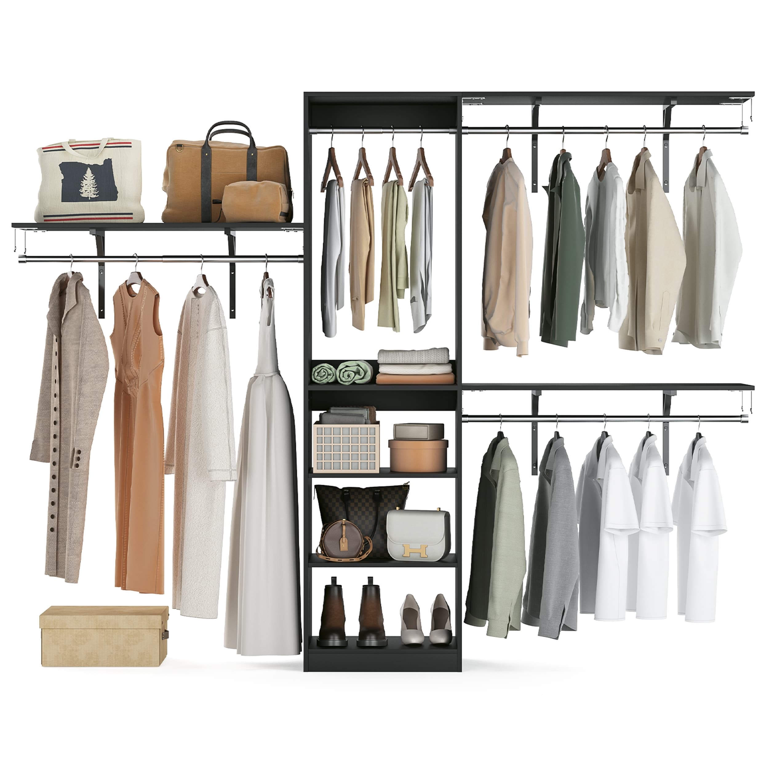 Grimm Freestanding Corner Closet System Set, Closet Organizer with Hanging Rods and Drawers