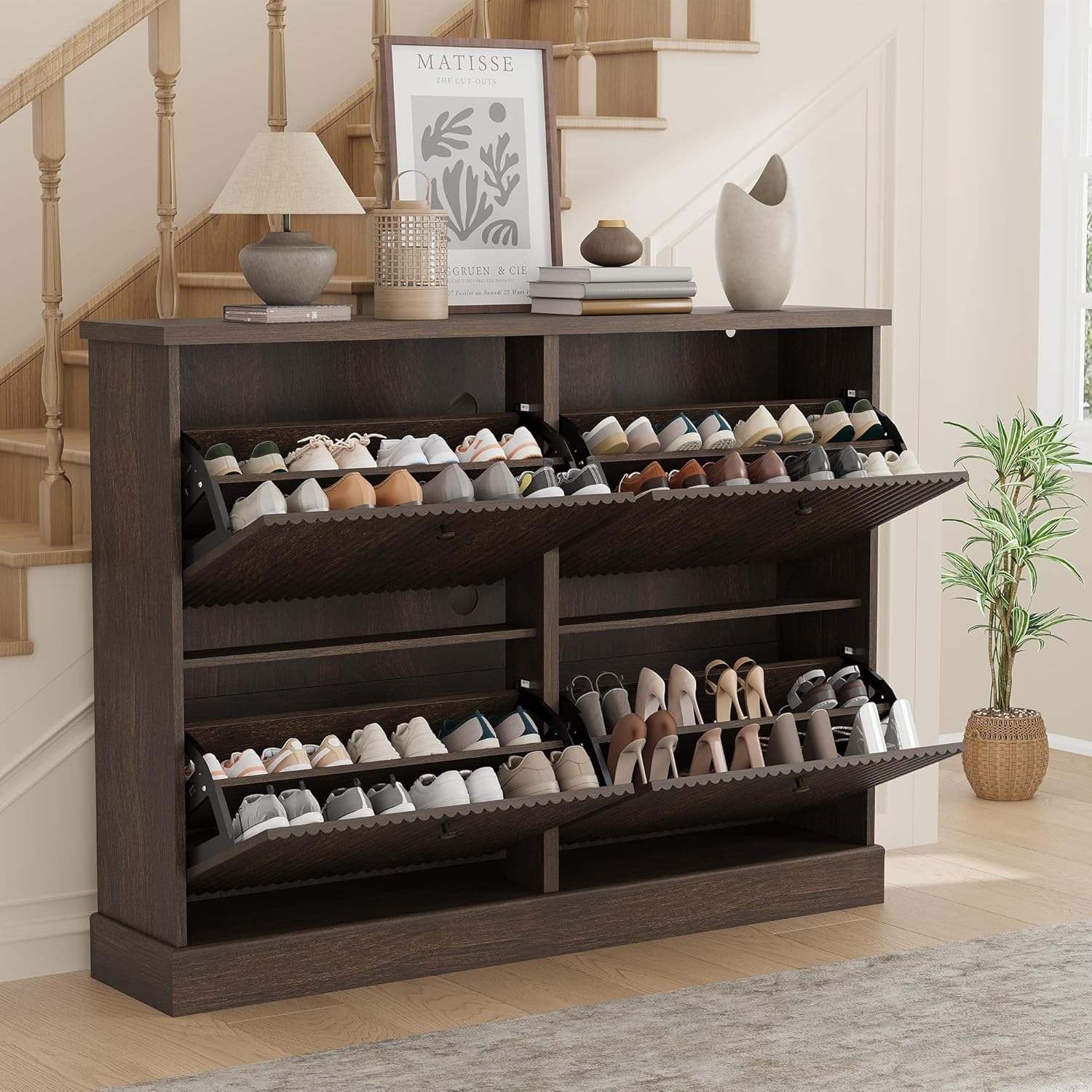 Fluted Shoe Cabinet Storage with 4 Flip Drawers, Fluted Narrow Shoe Organizer with Adjustable and Removable Shelves