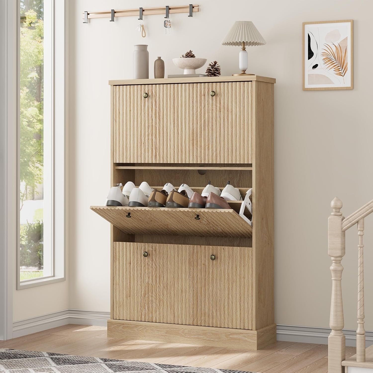 Fluted Shoe Cabinet Storage with 3 Flip Drawers, Fluted Narrow Shoe Organizer with Adjustable and Removable Shelves