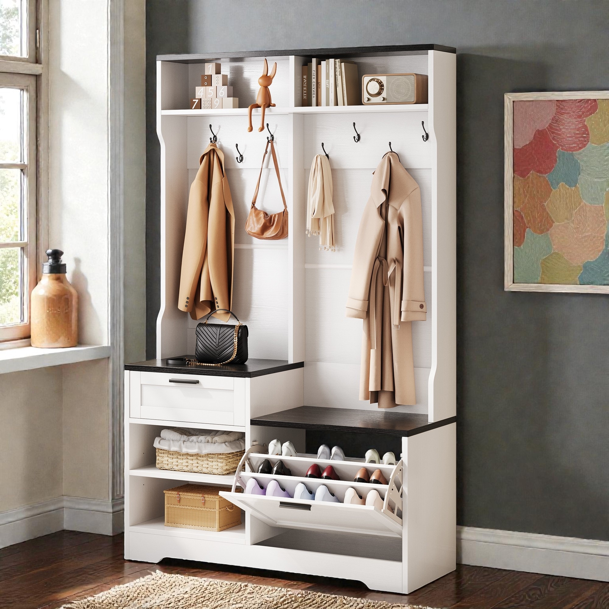 Farmhouse Entryway Hall Tree with Bench, Hooks, Drawers, Open Cubbies and 3-Tier Flip Shoe Cabinet, Coat Rack Storage Organizer