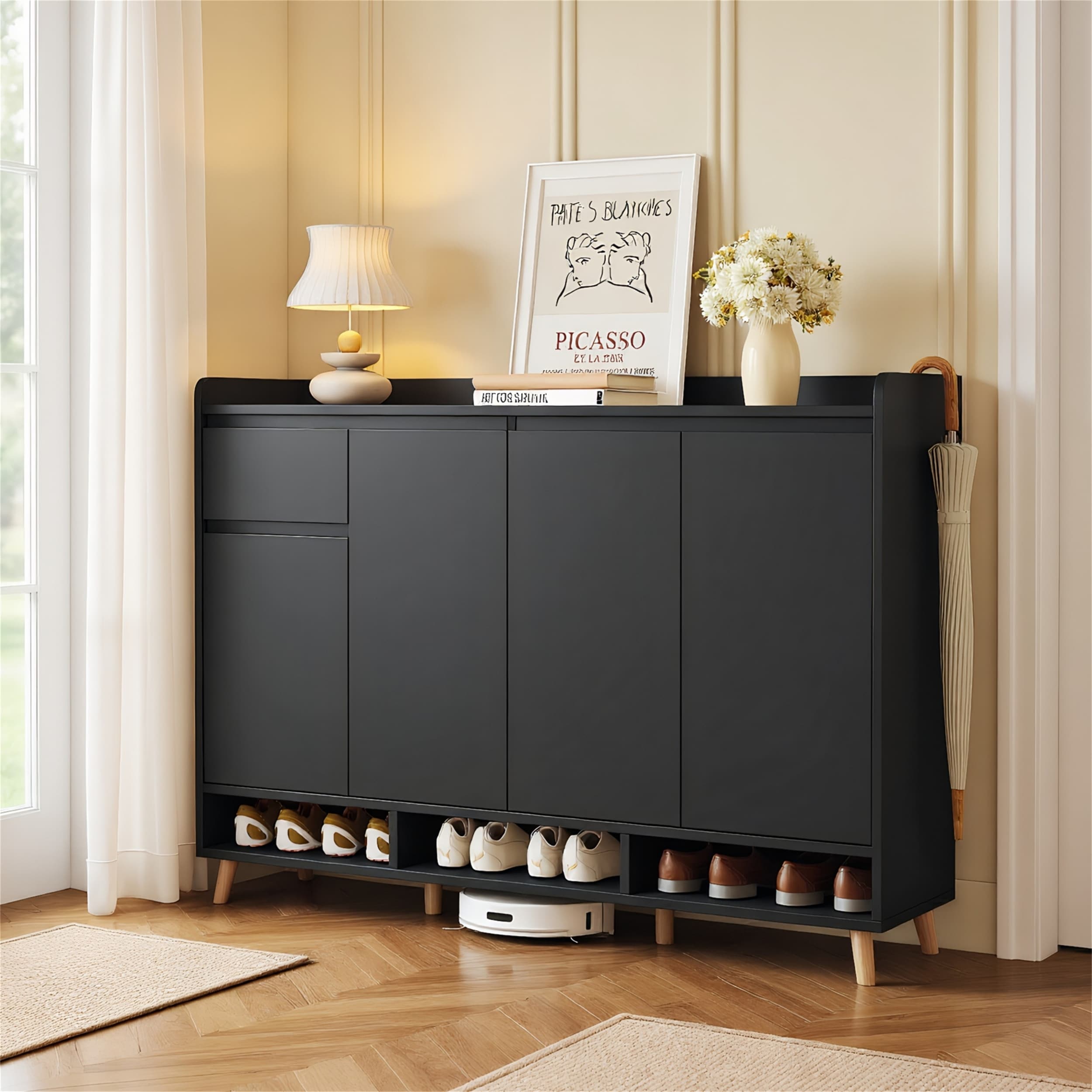 Modern Storage Shoe Cabinet with Adjustable Shelves, 6 Solid Wood Legs