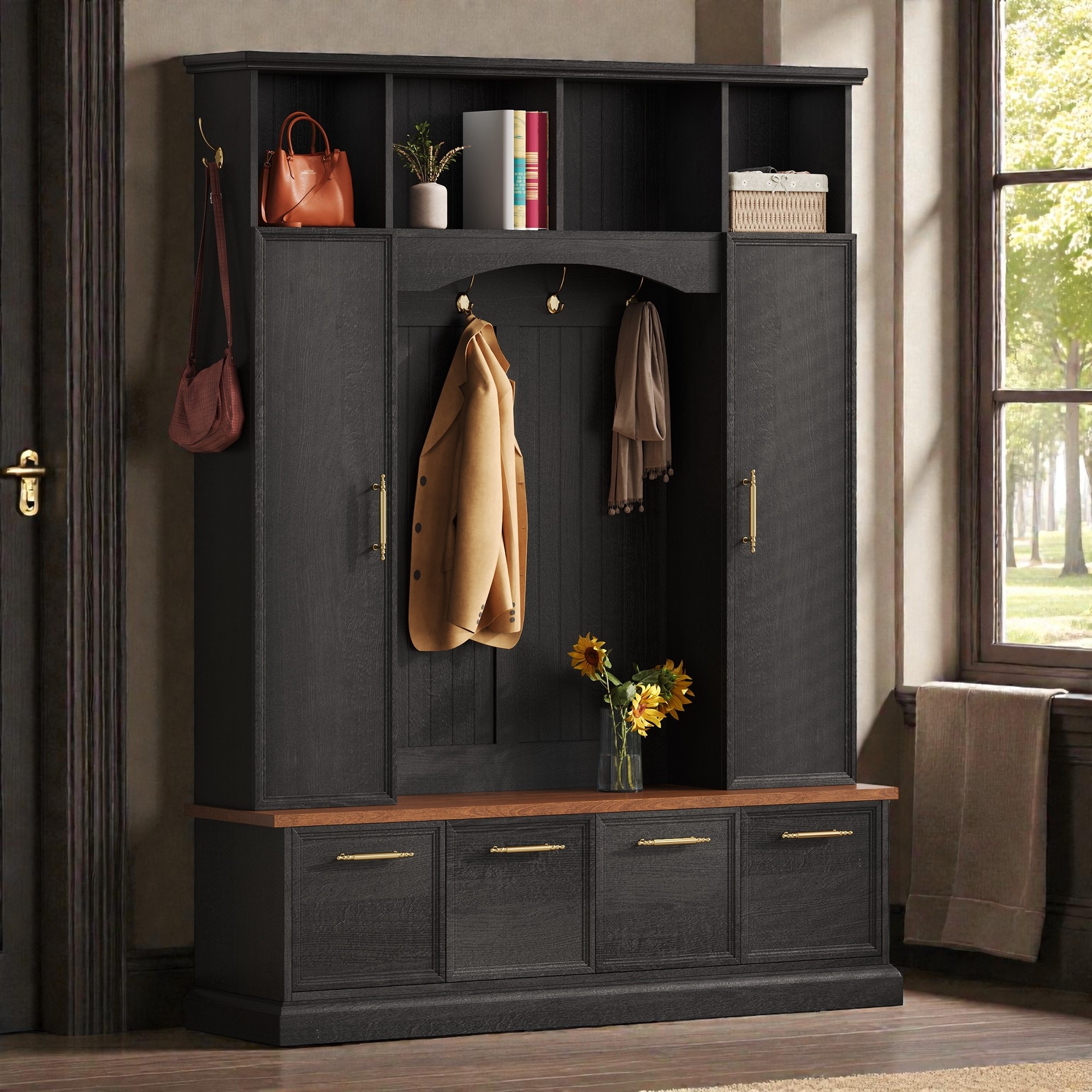 Farmhouse Hall Tree with 4 Hidden Hooks, Walnut Bench and 8 Door Shoe Cabinets, 4-in-1 Entryway Storage Cabinet for Living Room