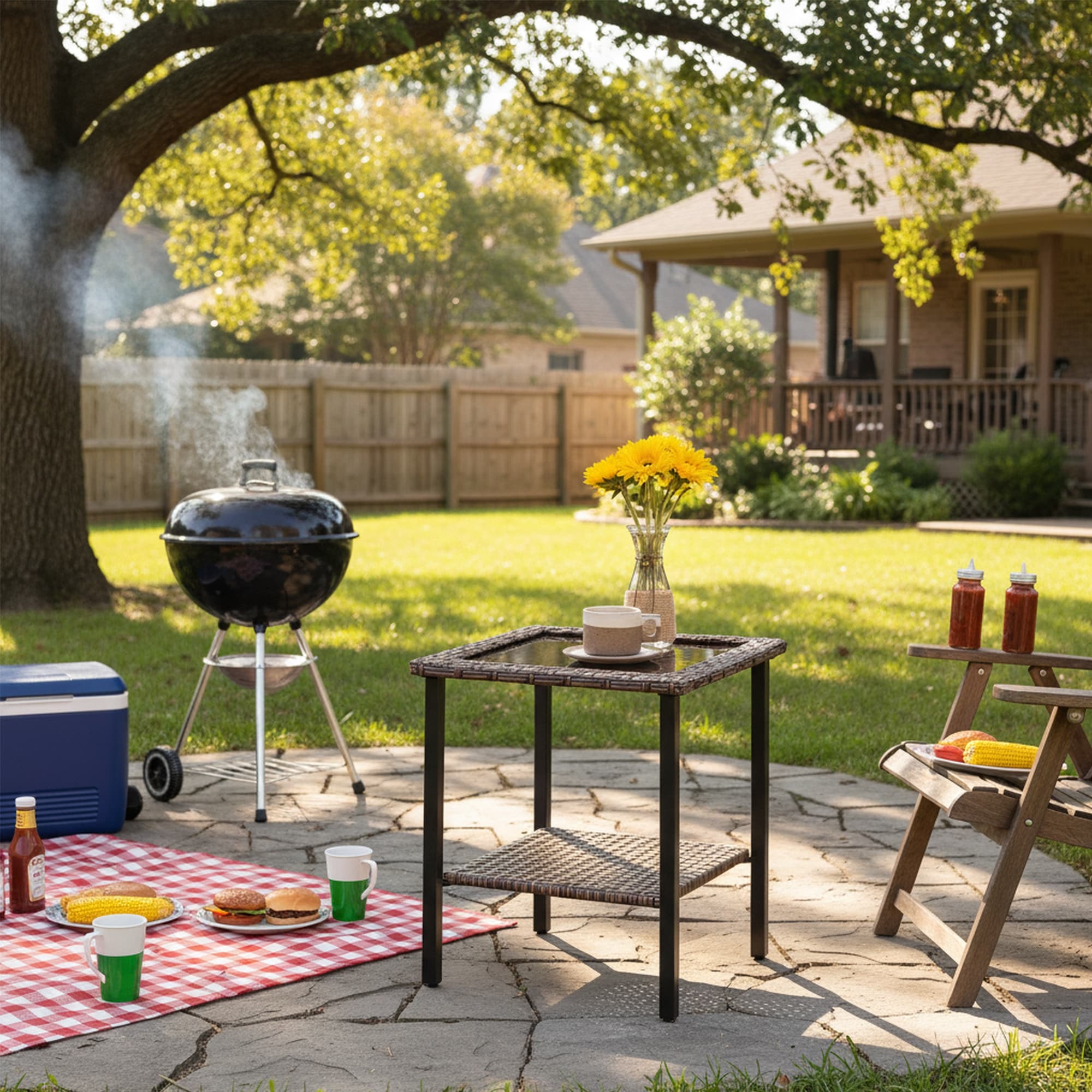 2-Tier Side Table, Outdoor Dark Brown Rattan Frame with Tempered Glass Top Accent Table