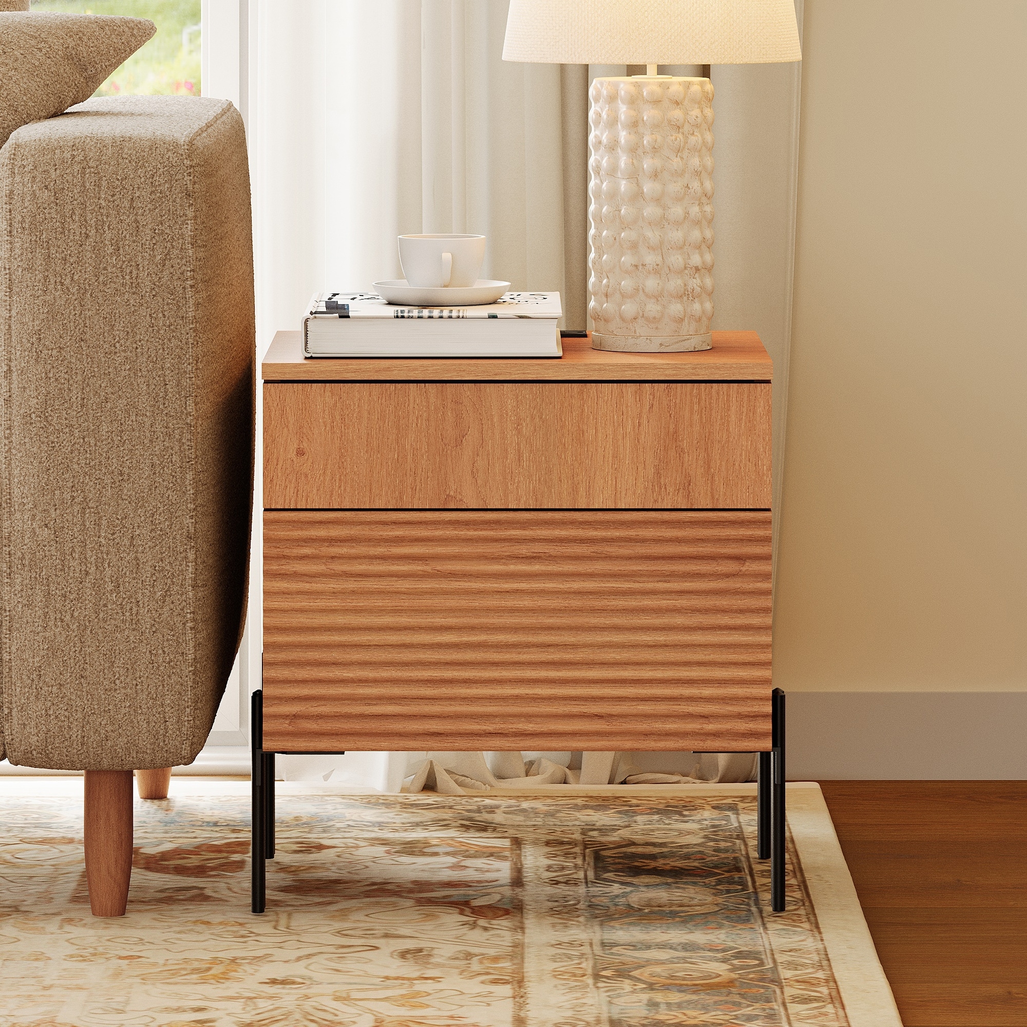 WAMPAT Fluted Nightstand with Charging Station,Modern Side Table with 2 Drawers