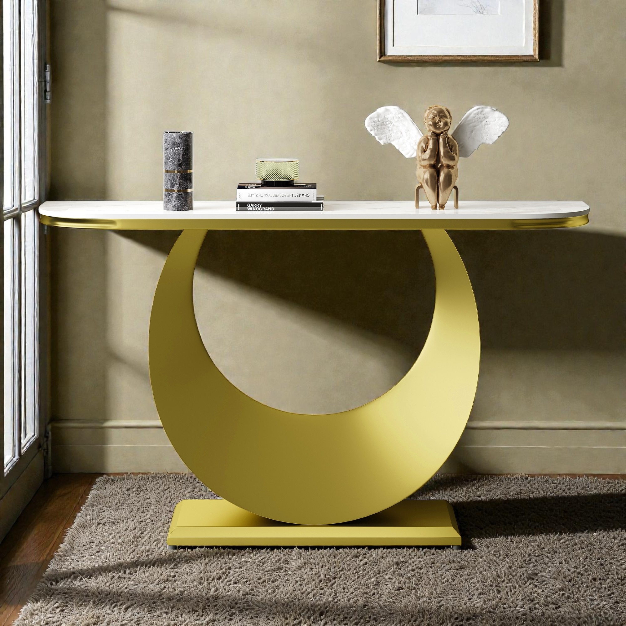 47 Inch Half-Console Table with Faux Marble Top & Gold Metal Base, Modern Narrow Entryway Table for Hallway & Living Room