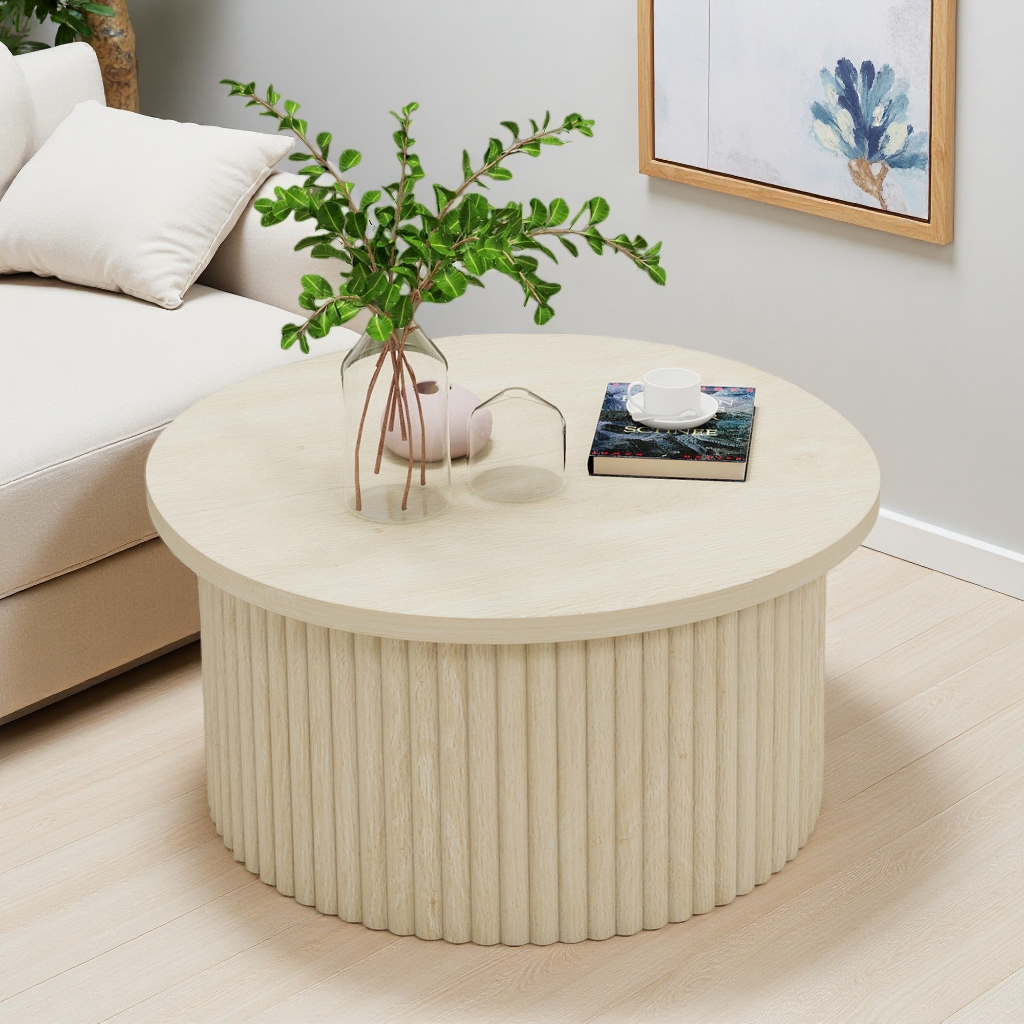 Round Wood Coffee Table with Sturdy Pedestal Base for Modern Apartments