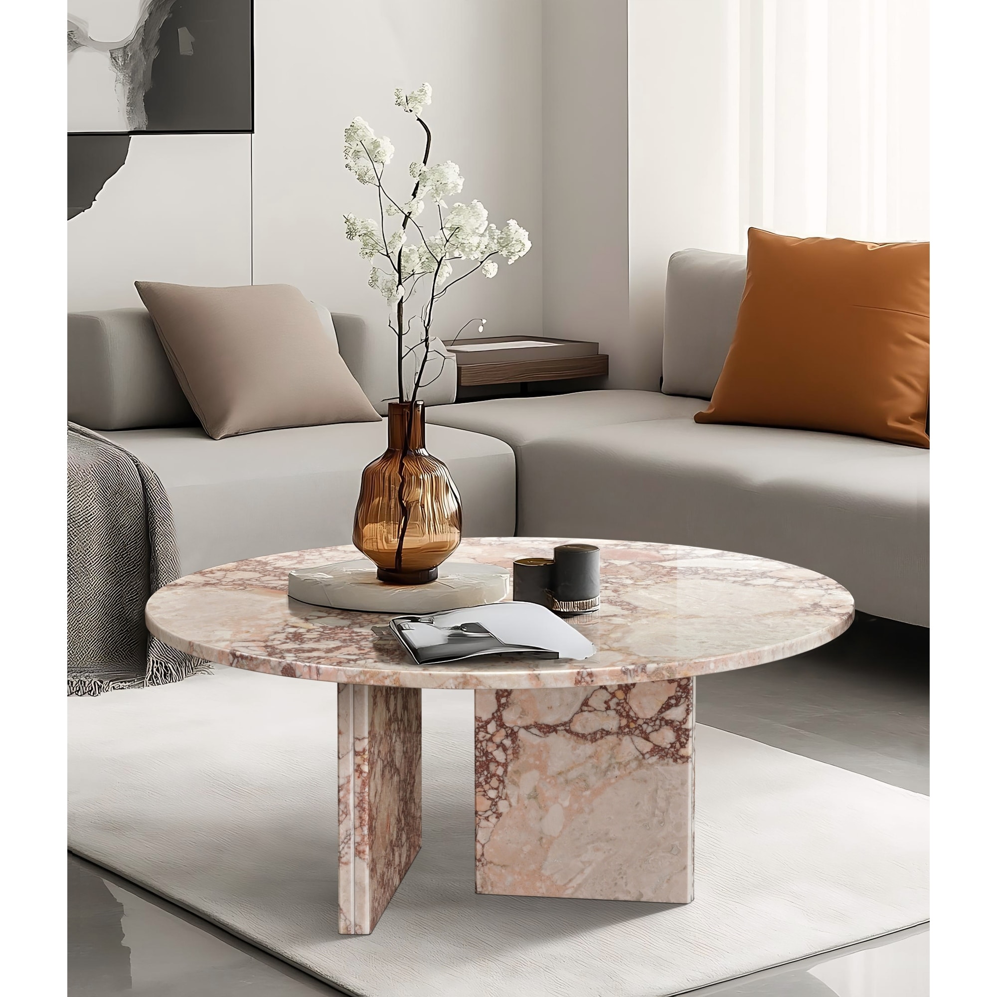 Roomfitters Round Natural Marble Coffee Table, Genuine Stone Living Room Table, Real Marble