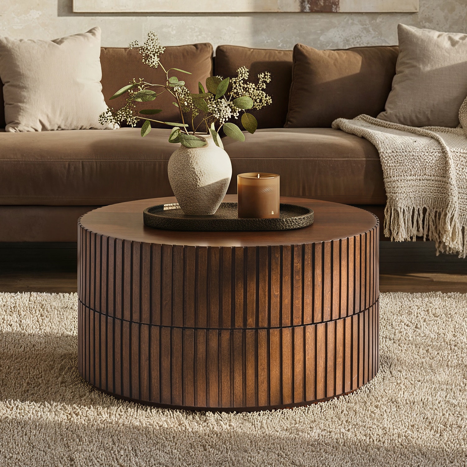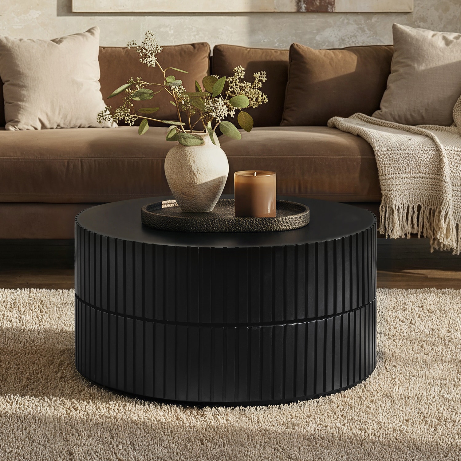 Round Coffee Table with 6.8" Thick Tabletop, Modern Drum End Table, Minimalist Fluted Center Table with Sturdy Base