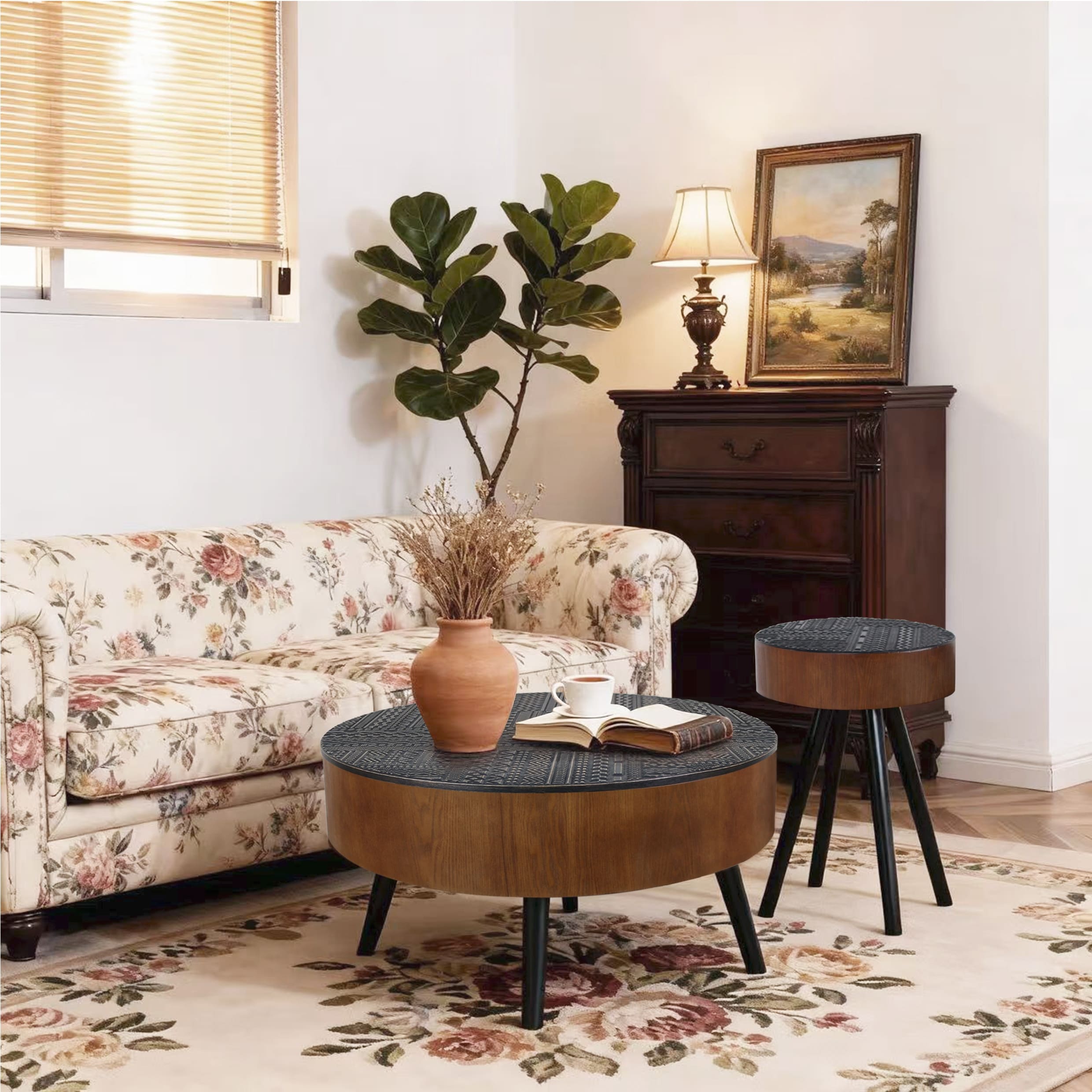 Round Carved Coffee Table With Storage Space Mid Century Modern Style Wooden