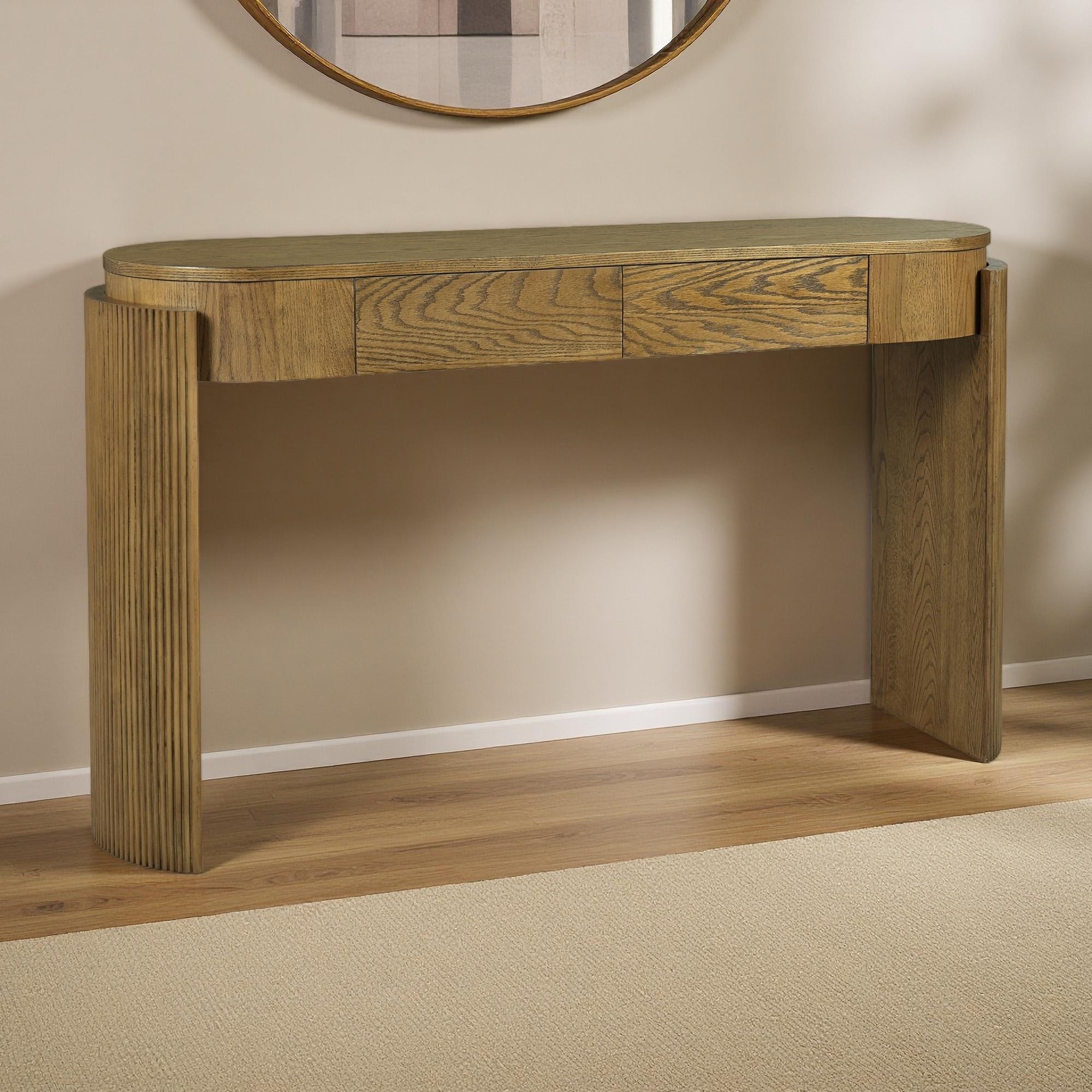 55" MDF + Oak Veneer Console Table with Oval Top - Fluted Legs Entryway Table Featuring Natural Wood Grain & 2 Hidden Drawers