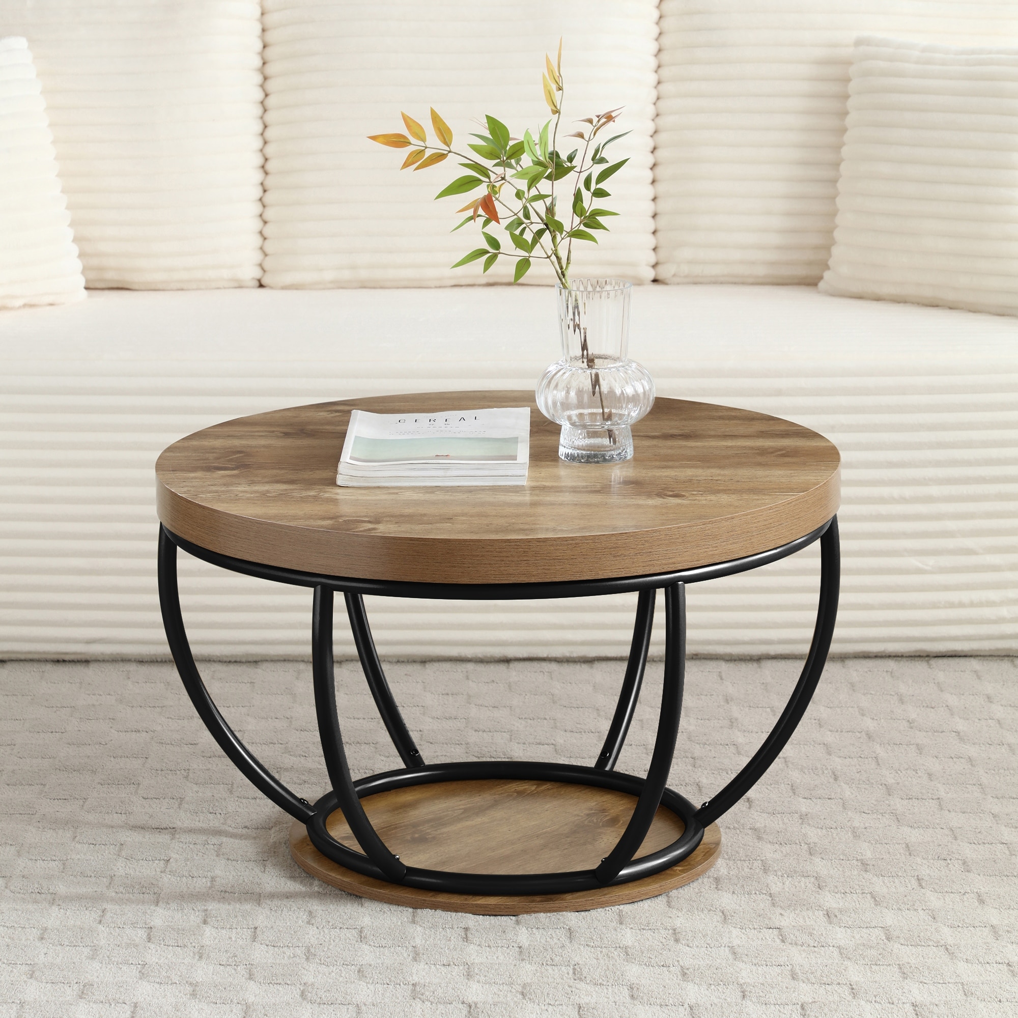 31" Round Industrial Coffee Table with 2-Tier Storage Shelves, Modern Wood & Black Metal Accent Center Table