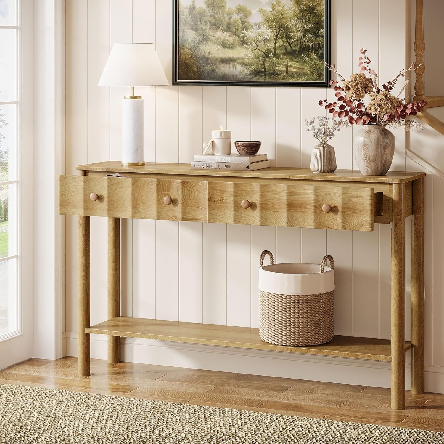 52" Wood Console Table with Curved Edge, Natural Texture, Perfect for Entryways and Living Rooms