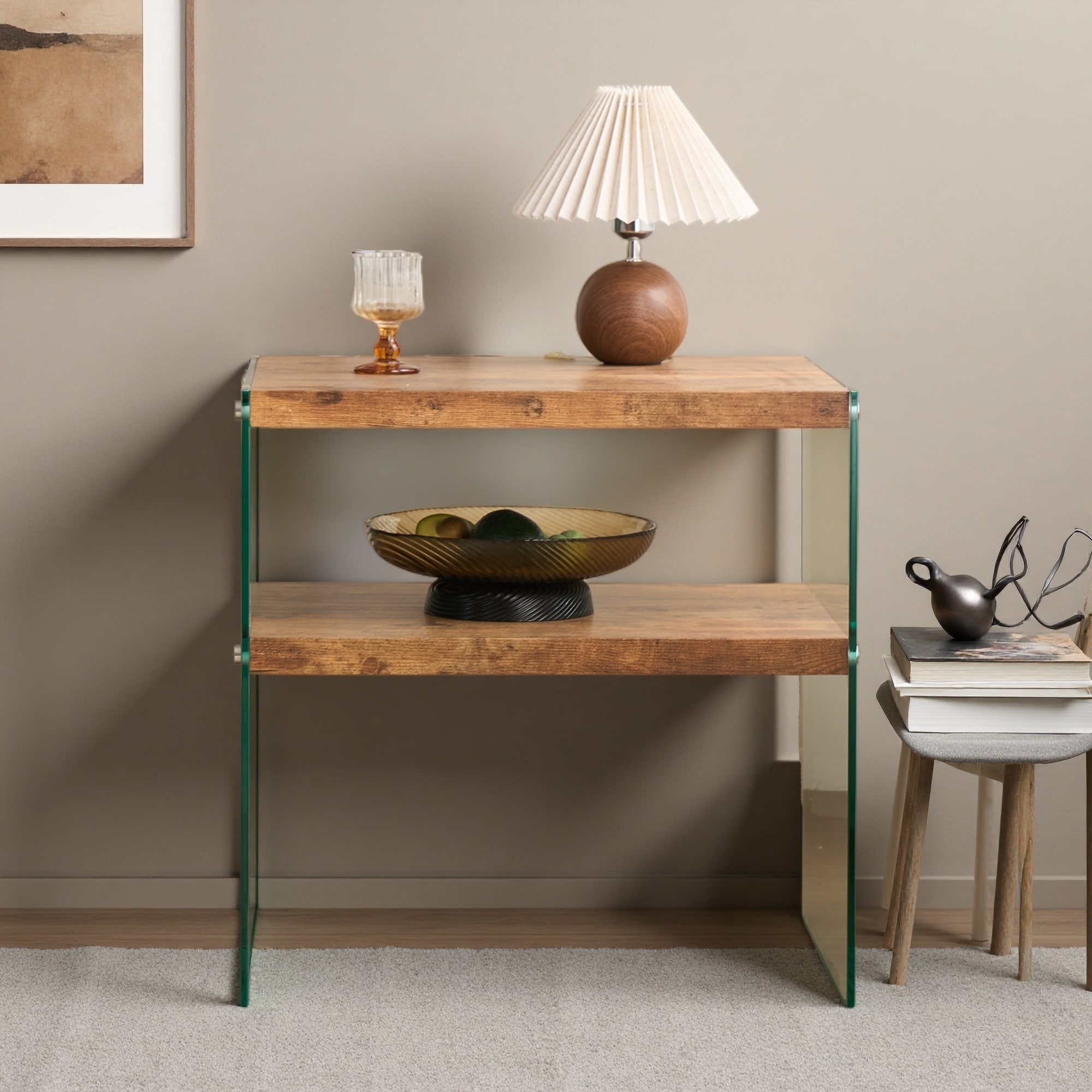 23.6" Compact Walnut MDF Side Table with Premium Tempered Glass Top, Multi-Purpose Design for Indoor and Outdoor Use