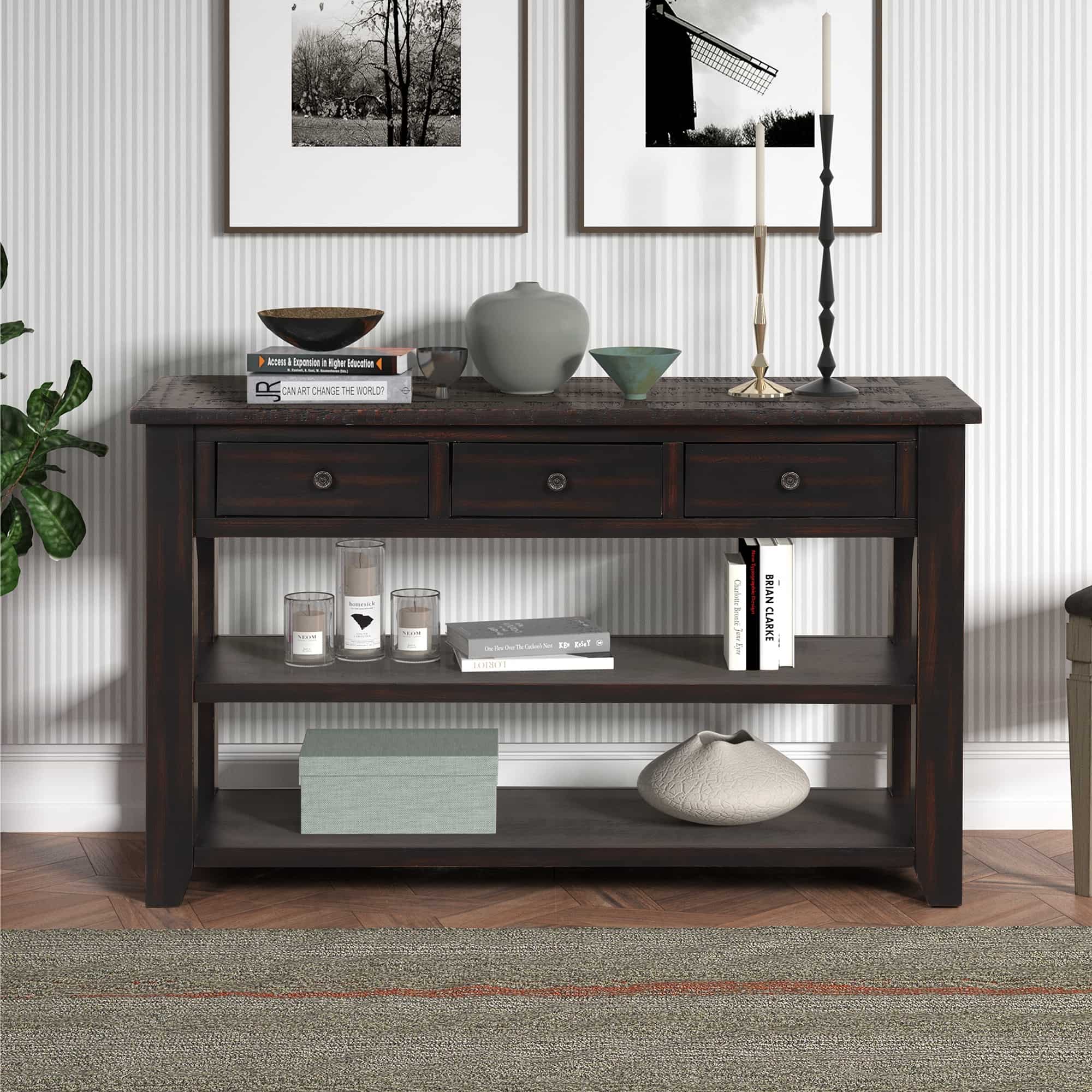 48 Inch Modern Console Table - Solid Pine with 3 Drawers & 2 Shelves, Distressed Black