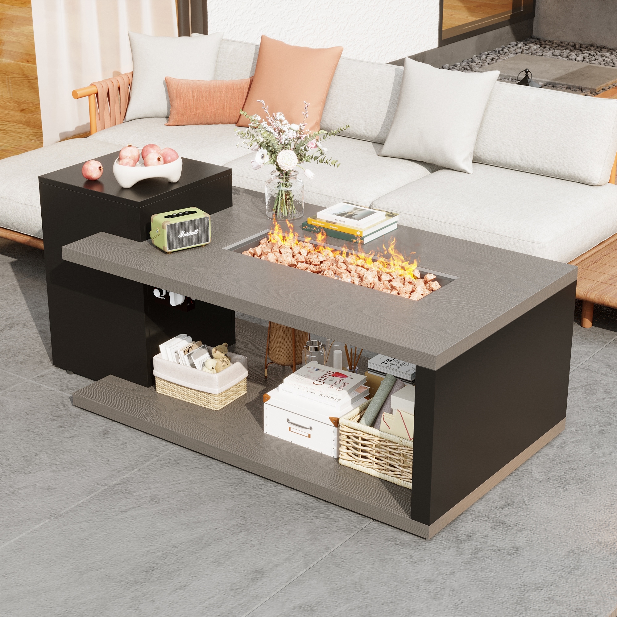 Modern Rectangular Gas Fire Pit Table with Faux Wood Top, Hidden 20lb Tank Storage, 50,000 BTU Outdoor Patio Heater