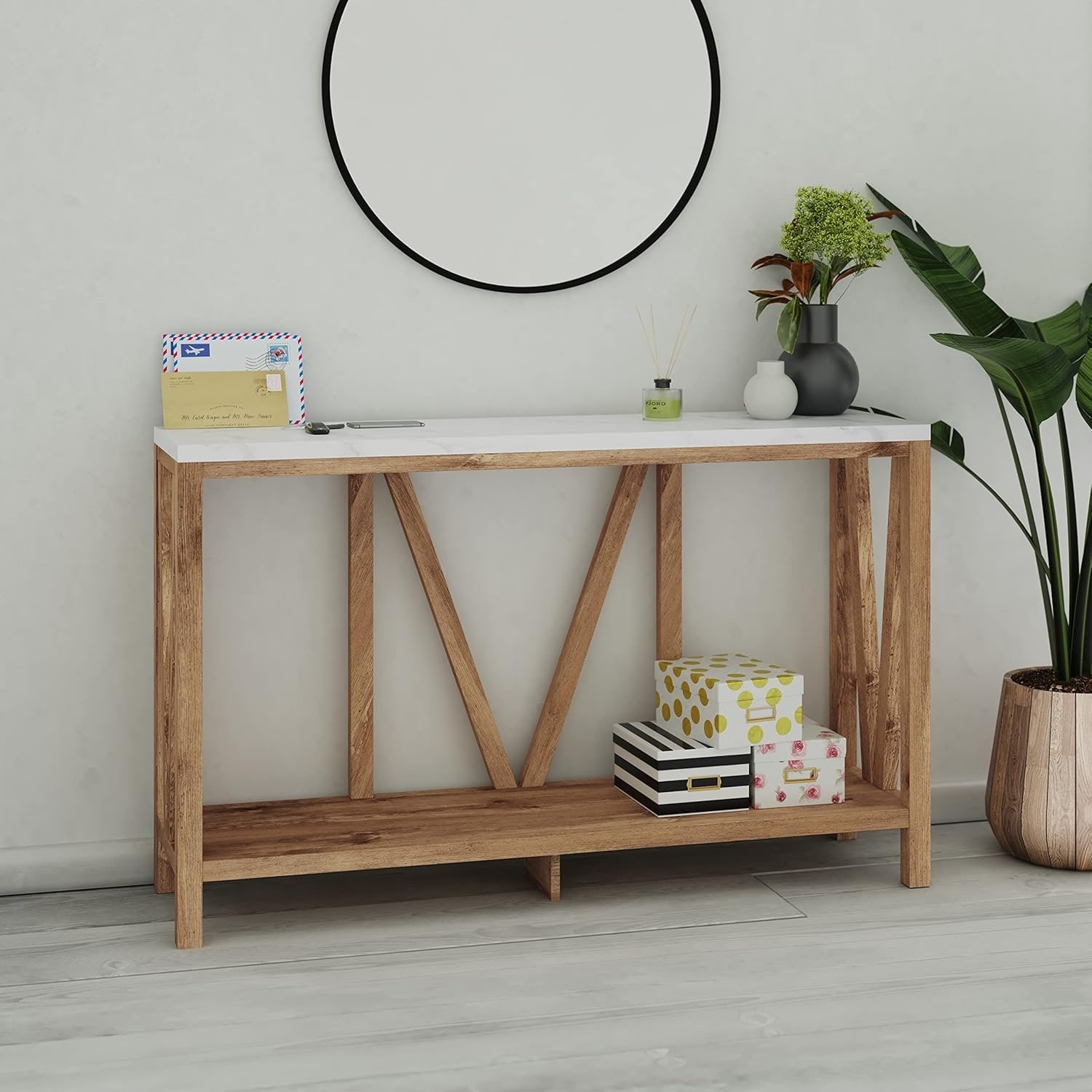 Owen Sofa Table - Modern Farmhouse Design, Warm Oak & Faux Marble Top, Engineered Wood
