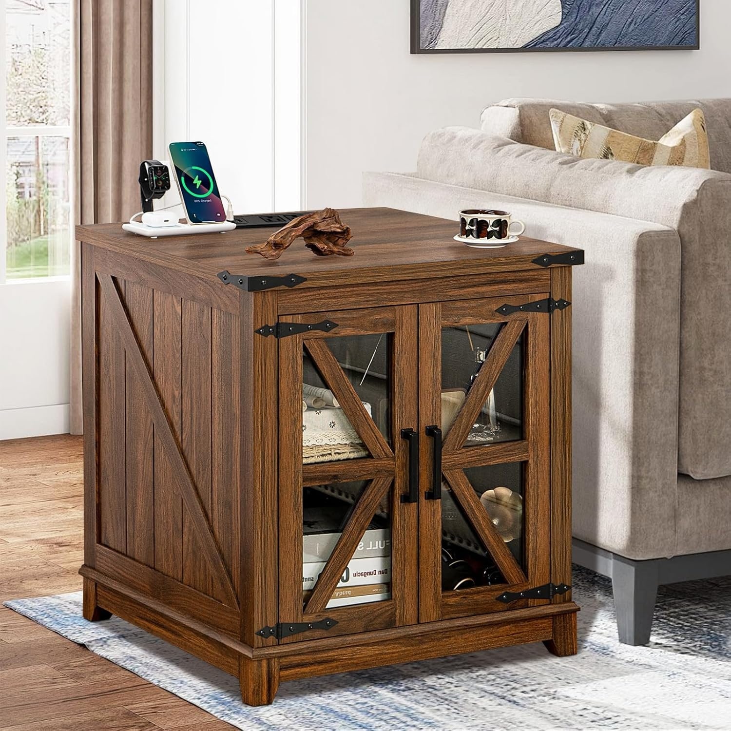 End Table with Charging Station, Glass Barn Door, Adjustable Shelf, Square Nightstand for Living Room, Bedroom, Office - Brown