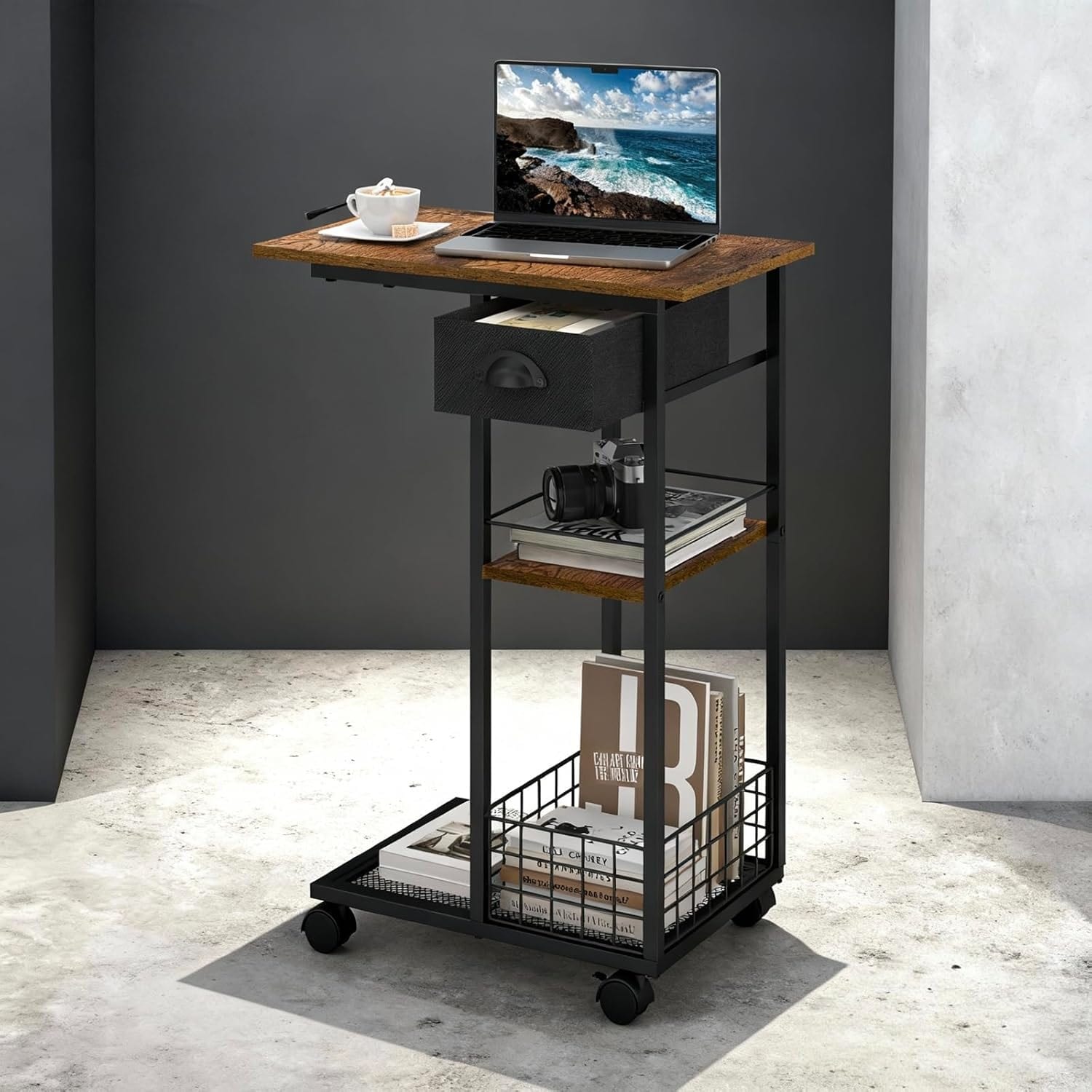 3-Tier Rolling Side Table with Drawer, Compact C Table for Couch, Narrow Space Desk, TV Tray, Bedside Table
