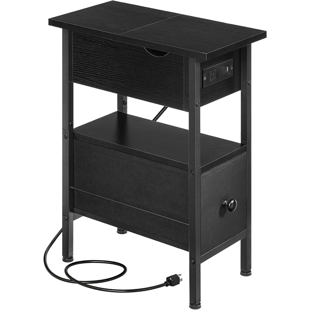 Flip Top End Table with Charging Station, Slim Storage Drawer & Shelves for Small Spaces - Black