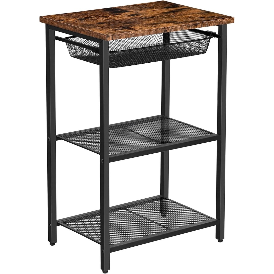 Small Side Table with Adjustable Metal Mesh Basket and Storage Shelf, Rustic Brown