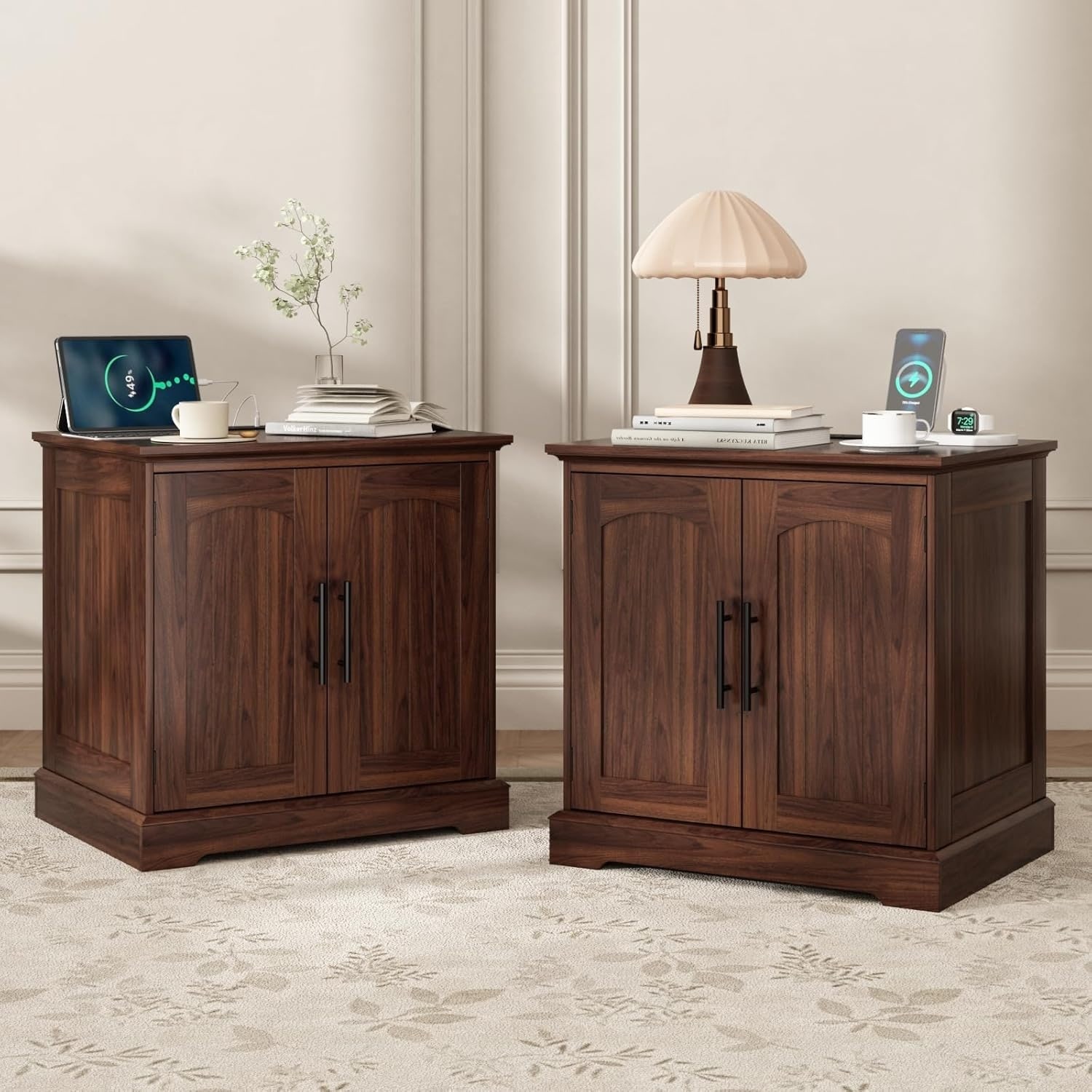 Rustic End Table with Charging Station, Farmhouse Wood Nightstand