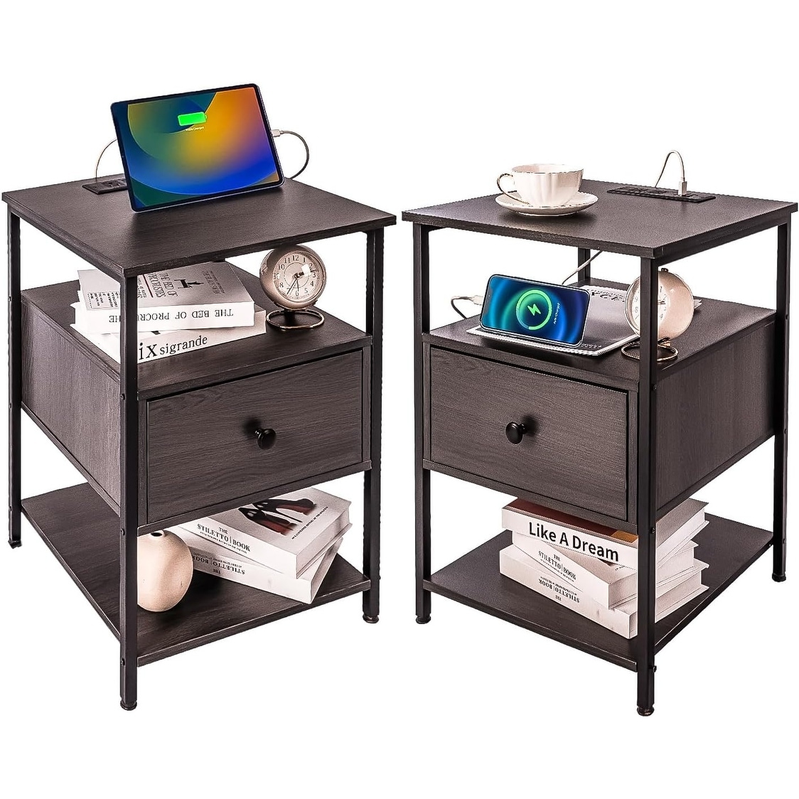 Wooden Nightstand with Charging Station, USB Port, Single Drawer, Dark Grey