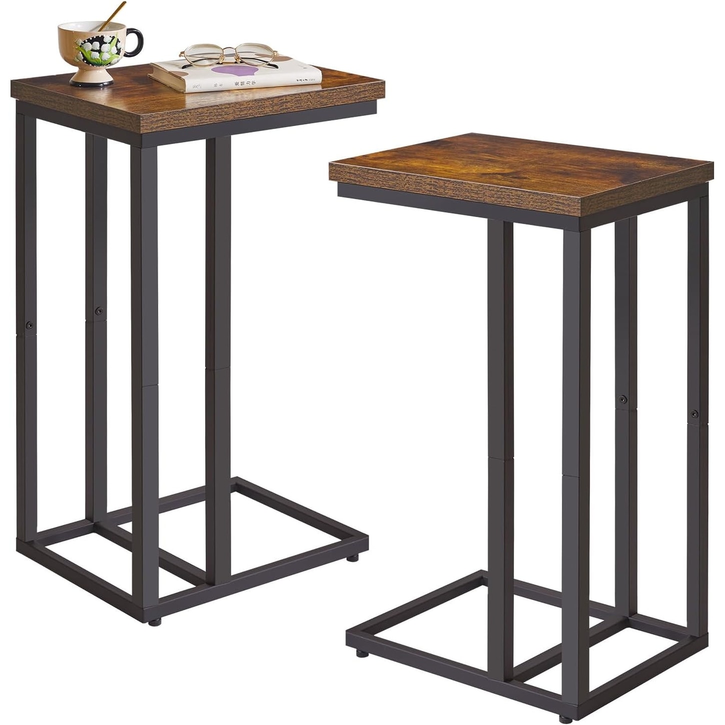 Small C-Shaped Side Table for Couch, Slide Under Laptop Desk, Living Room & TV Tray, Rustic Brown+Black