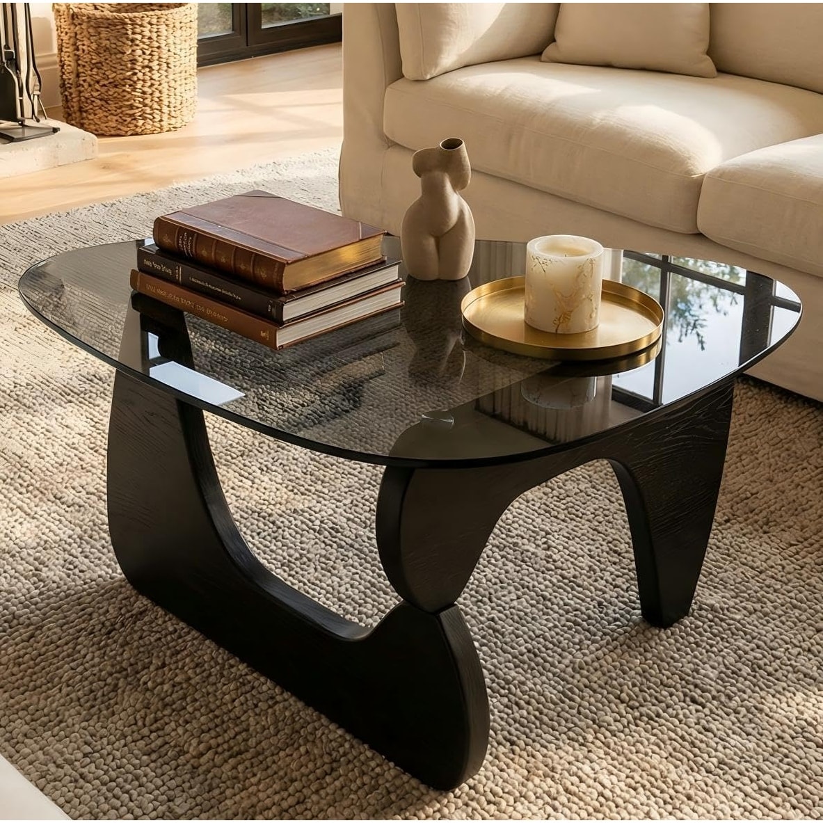 Modern Triangle Coffee Table with Tempered Glass & Wood Base, Low Profile Geometric Design, 32.3x22.4x16 Inch