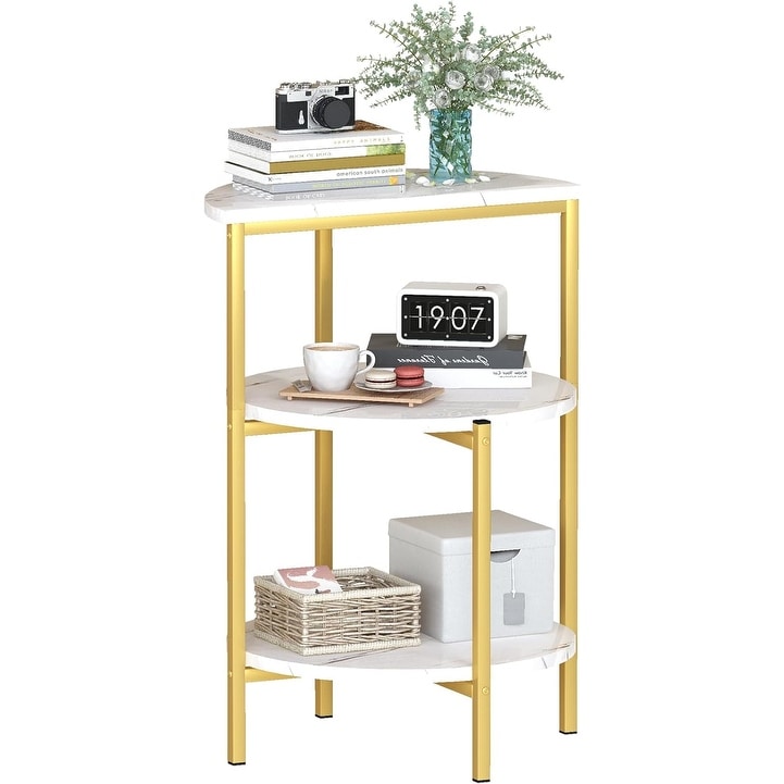 3-Tier Round Side Table with Metal Frame for Living Room or Bedroom, White+Gold