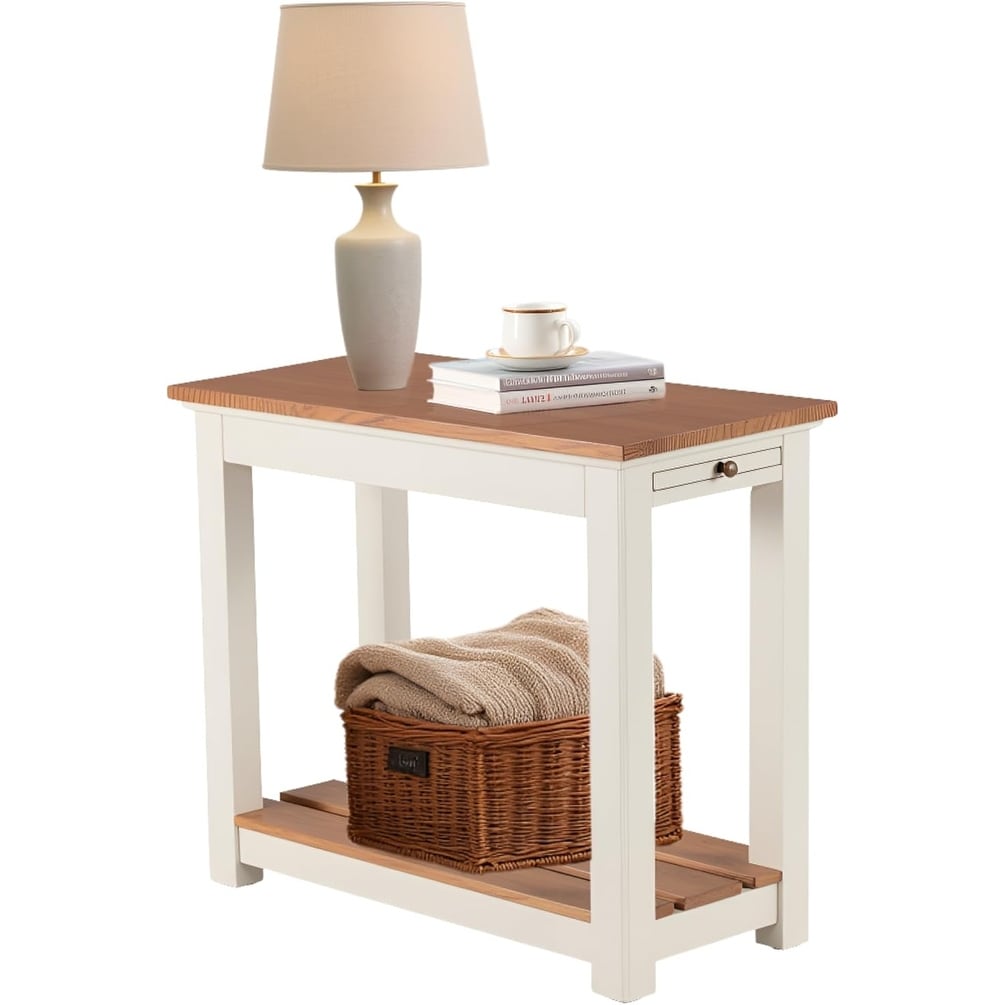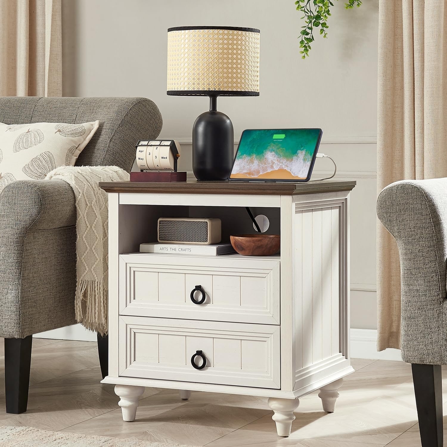 18" Wide End Table with Charging Station, Sofa Side Table with Drawers and Storage - Rustic Wood Living Room Table, White