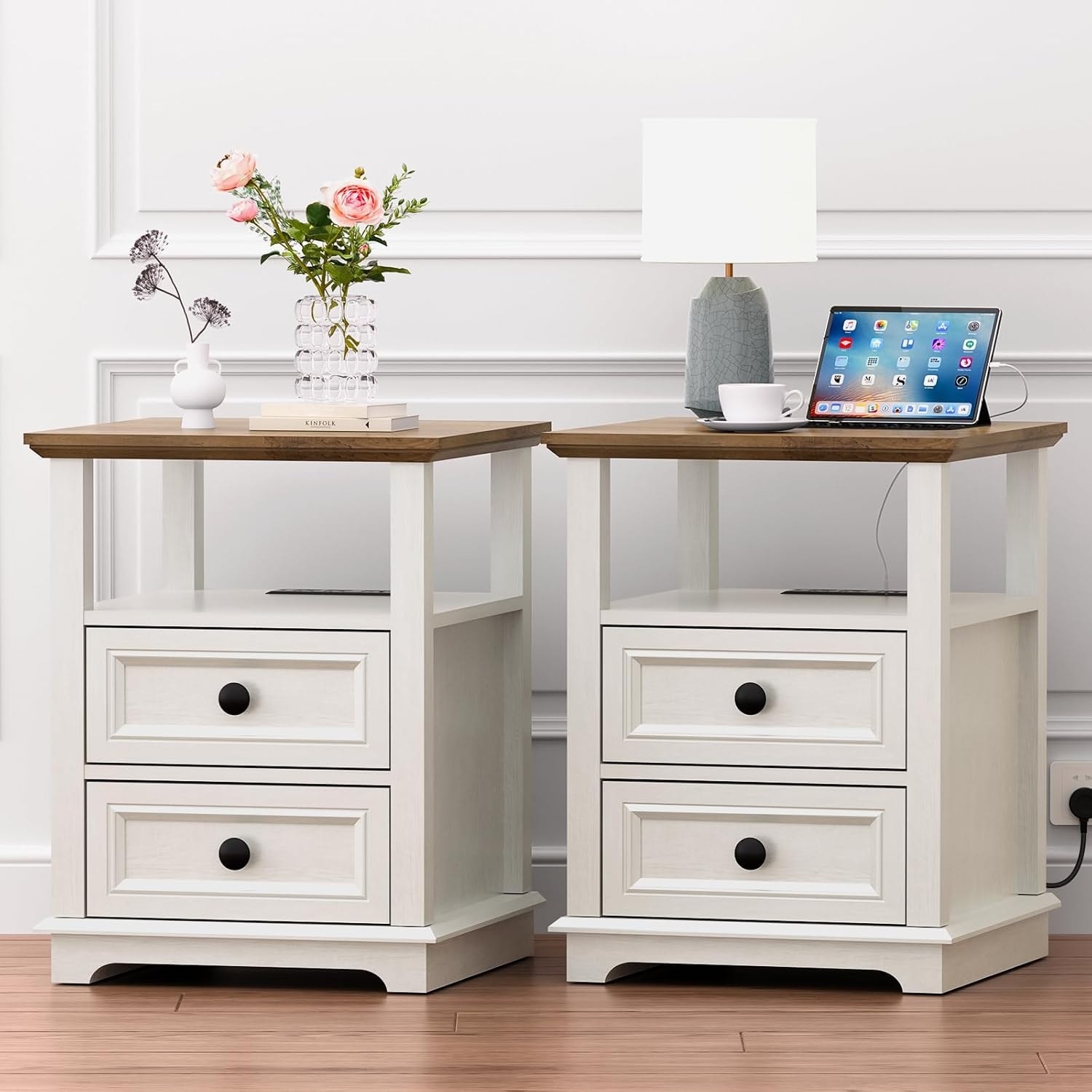 Rustic Wood Nightstand with Charging Station, 2-Drawer End Table & Open Shelf for Living Room or Bedroom