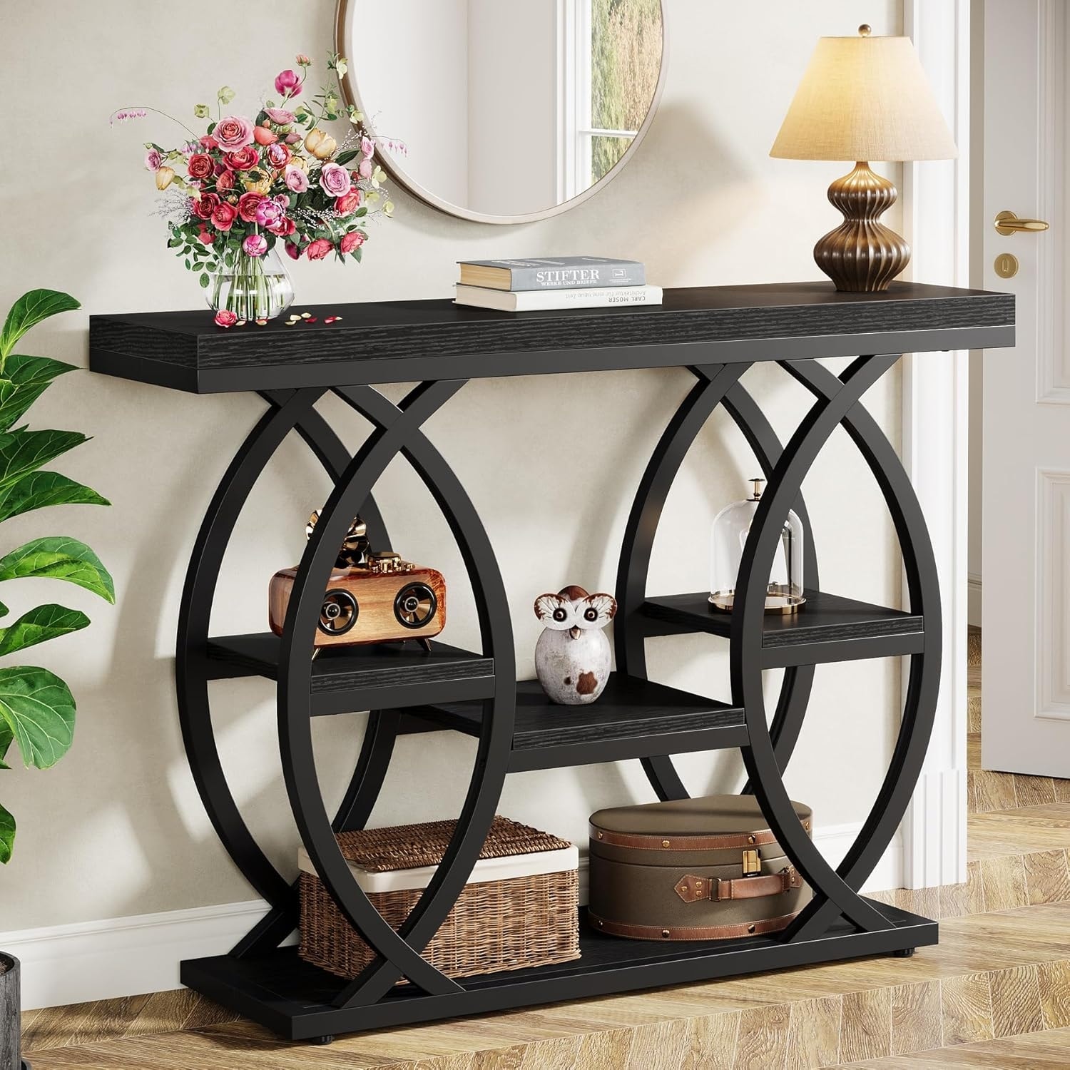 4-Tier Narrow Console Table with Storage Shelves, Wood & Metal Accent for Hallway, Foyer, Small Spaces - Black
