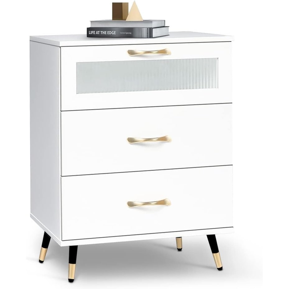 3 Drawer Nightstand, White & Gold Accent Bedside Table for Bedroom or Living Room - Modern Design