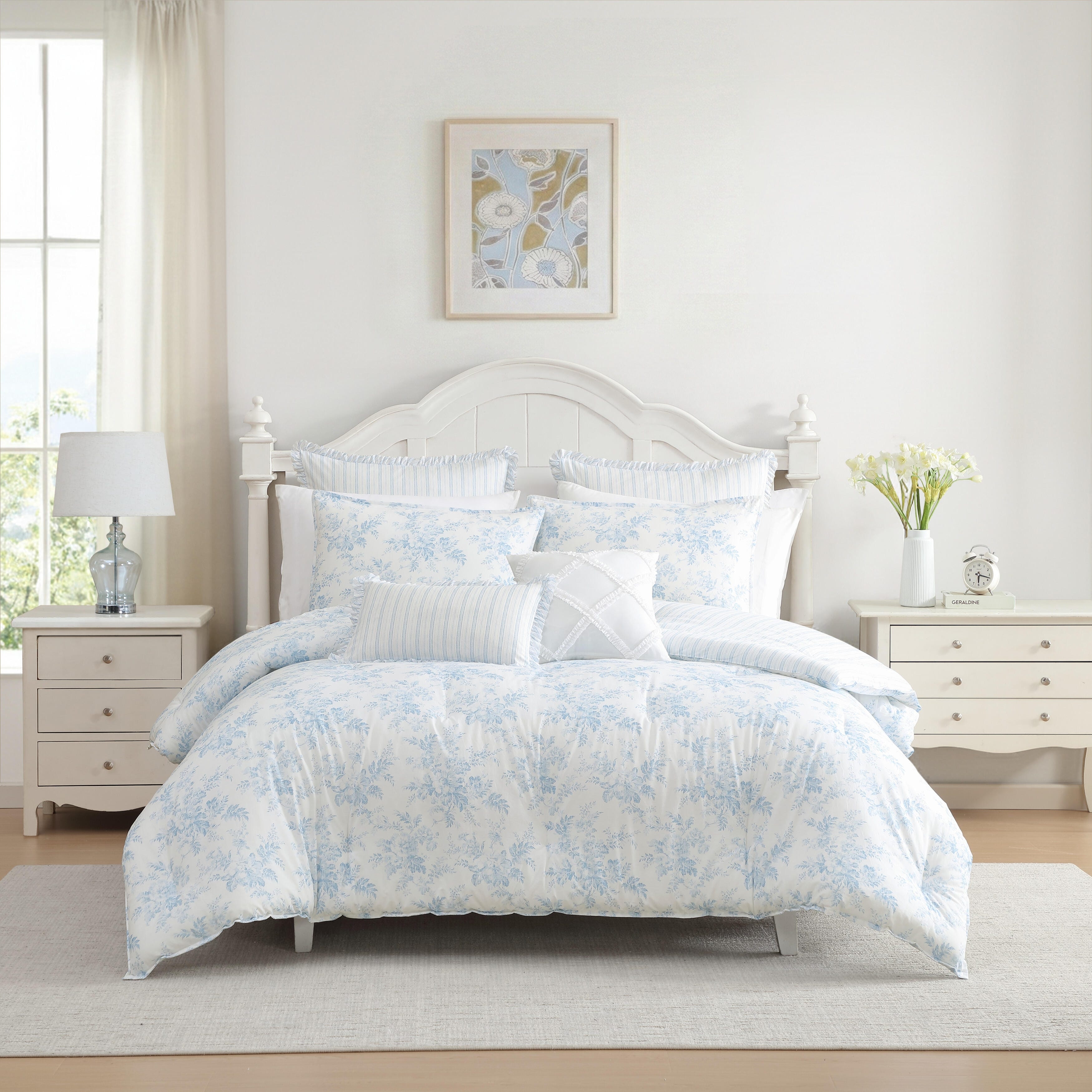 Laura Ashley Annalise Floral Reversible Stripe Breathable Cotton Comforter Set (Blue)