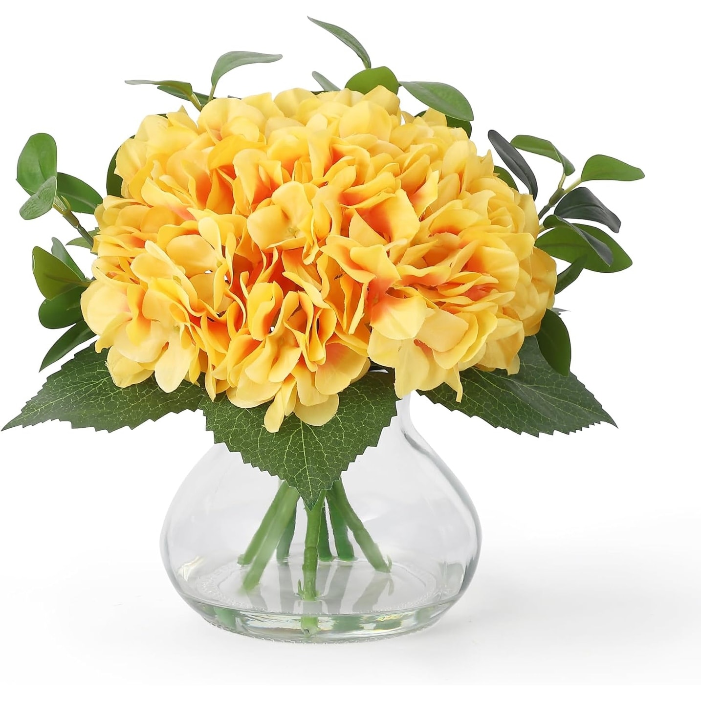 Artificial Flowers in Vase, Silk Faux Hydrangea Fake Flower Arrangements with Glass Vase and Faux Water