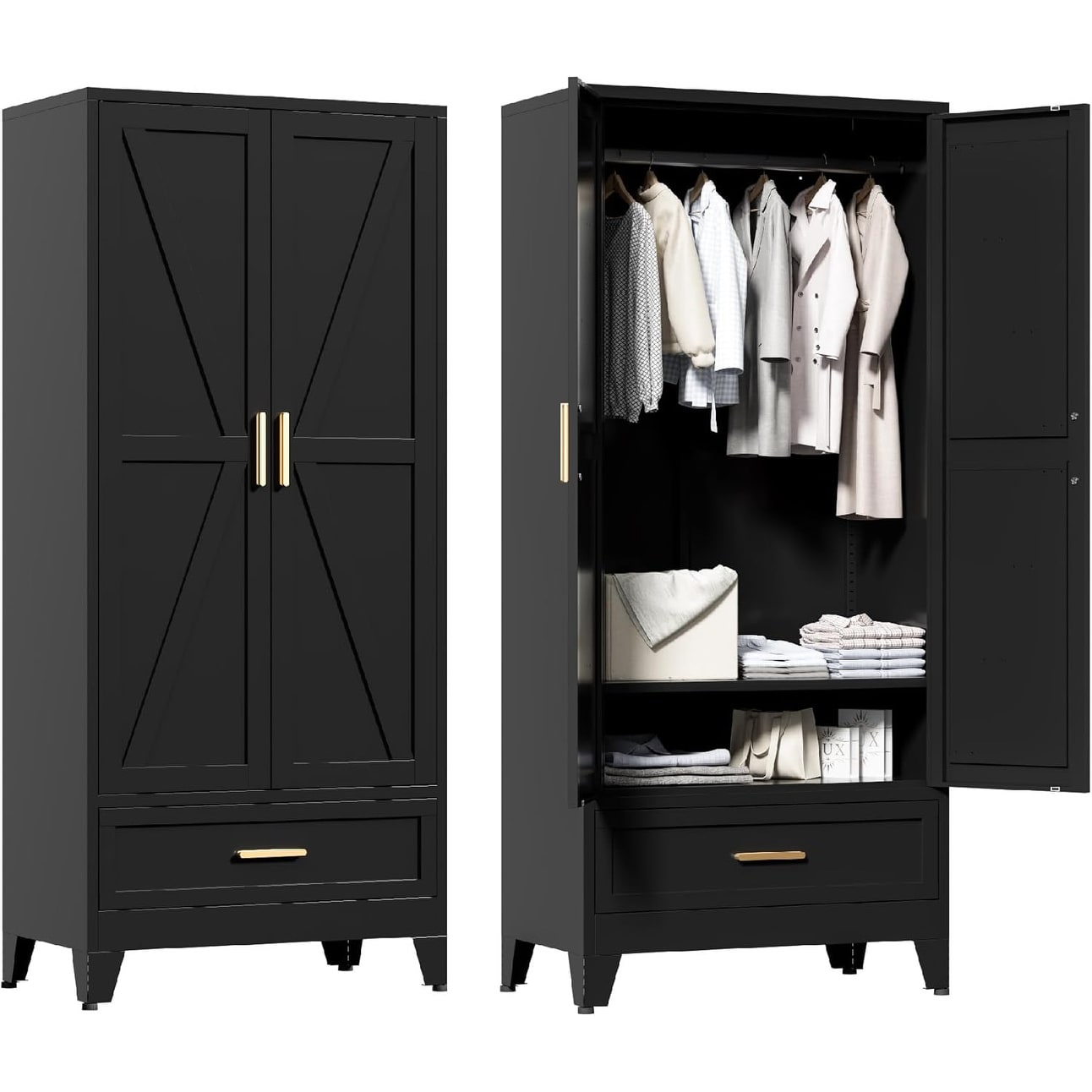71'' Farmhouse Metal Wardrobe Cabinet with Hanging Rod, Adjustable Shelves & Drawer for Bedroom, Living Room, Office