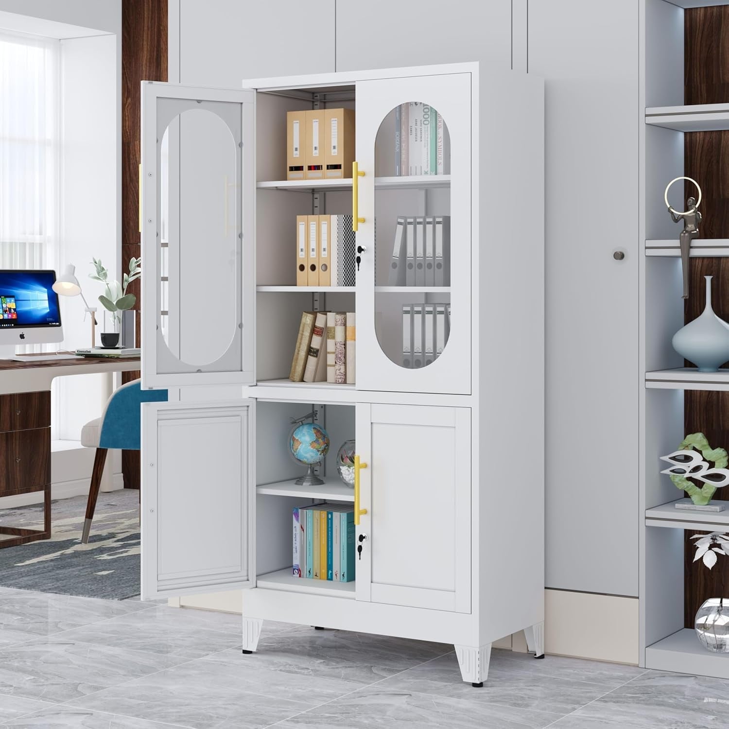 61-inch White Metal Locking File Cabinet with Glass Doors and Adjustable Shelves for Office, Home, Garage, Gym, School