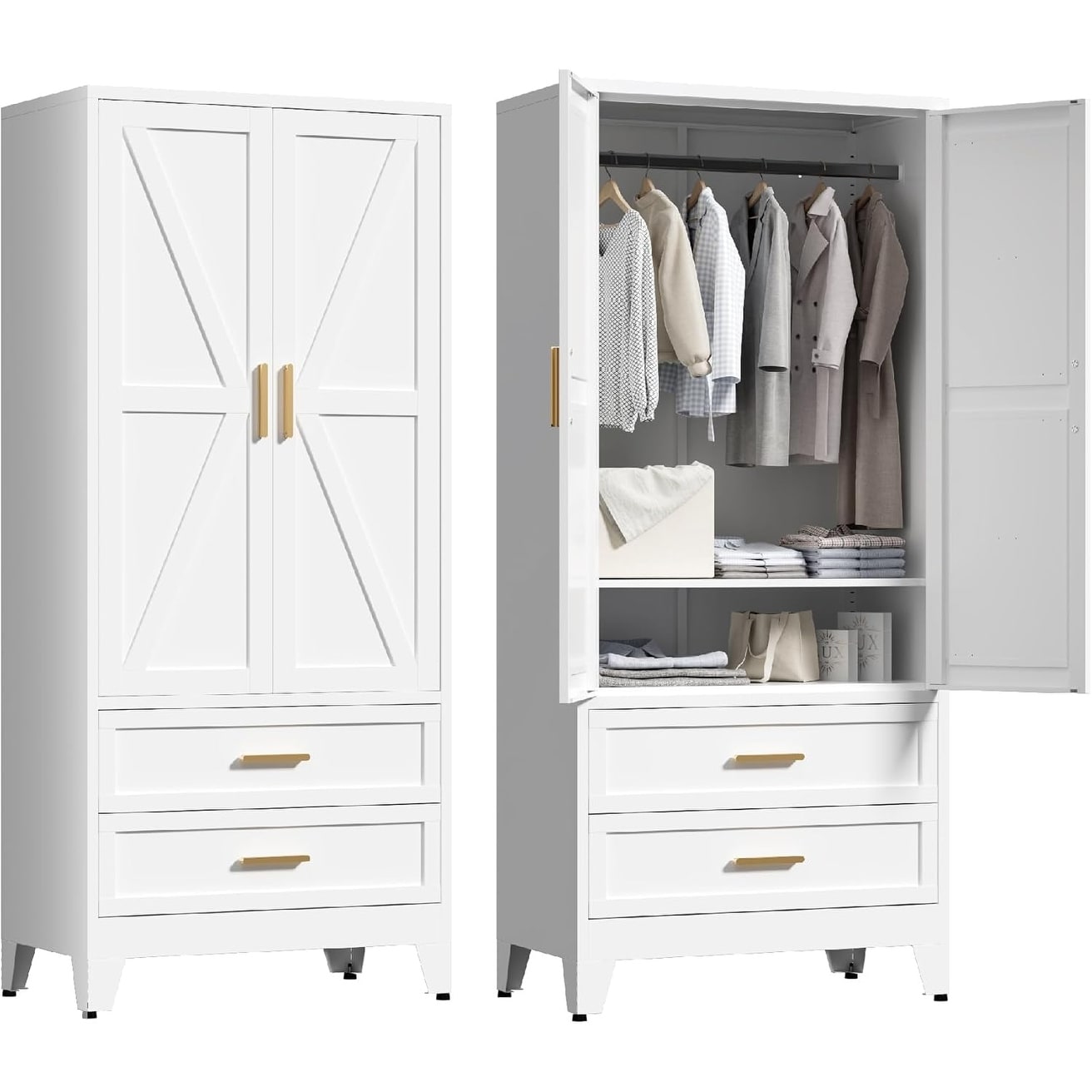 71'' Farmhouse Metal Wardrobe Cabinet with Hanging Rod, Adjustable Shelves, and 2 Drawers for Bedroom, Living Room, or Office