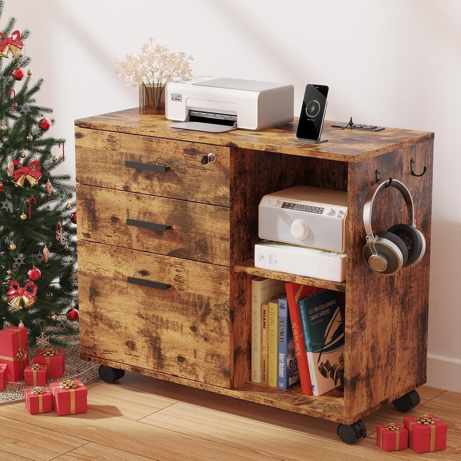 3-Drawer Mobile File Cabinet with USB Charging, Lockable Storage, and Adjustable Shelves for Home Office