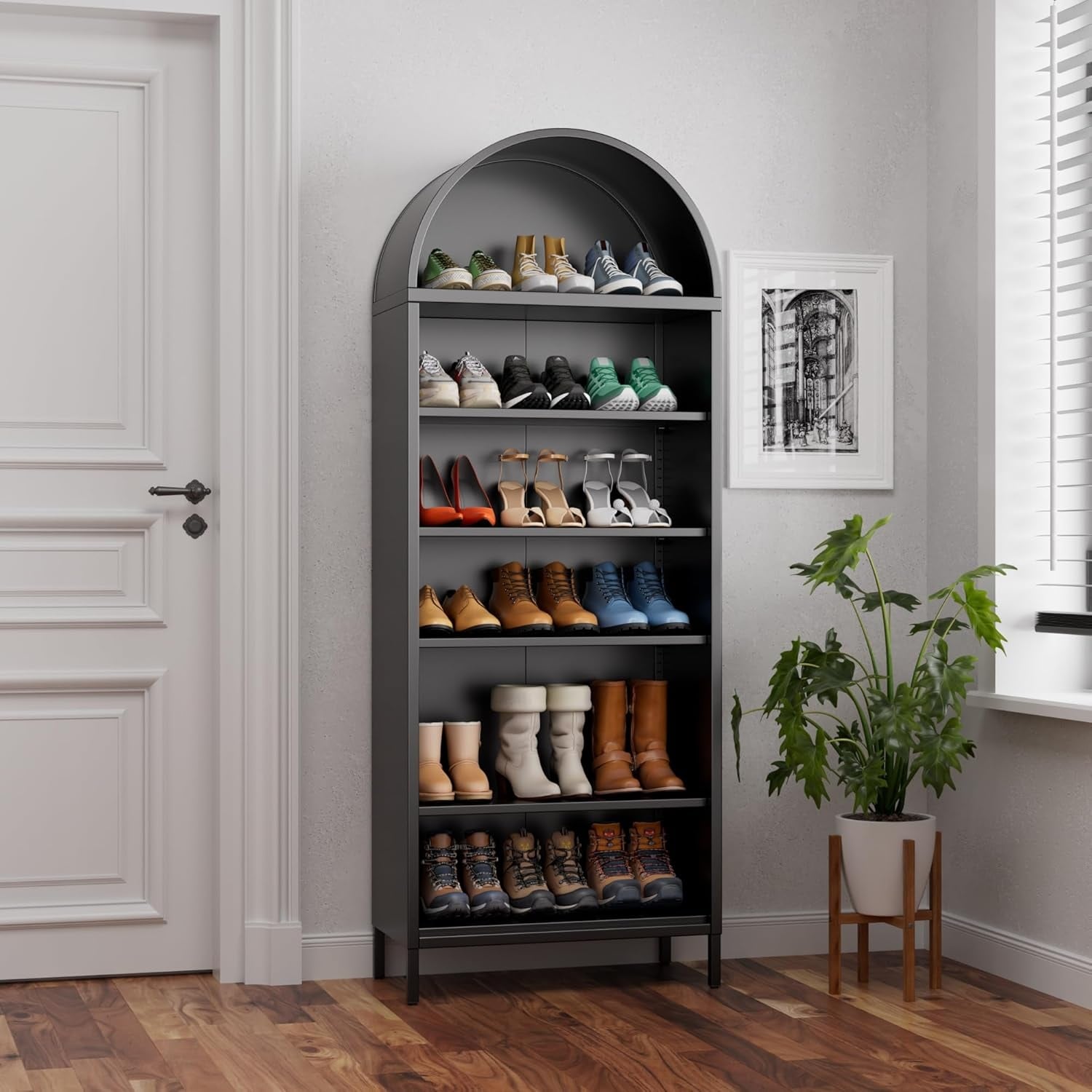 6-Tier Tall Metal Arched Bookcase with Adjustable Shelves, Modern Farmhouse Display Cabinet for Living Room, Black