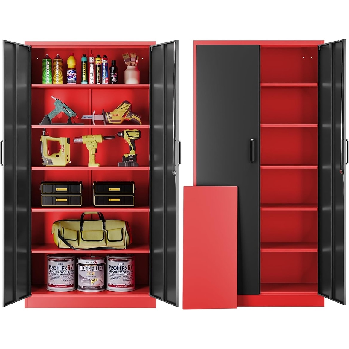 72 Inch Tall Metal Storage Cabinet with Lock, 2 Doors & 5 Adjustable Shelves, Red & Black