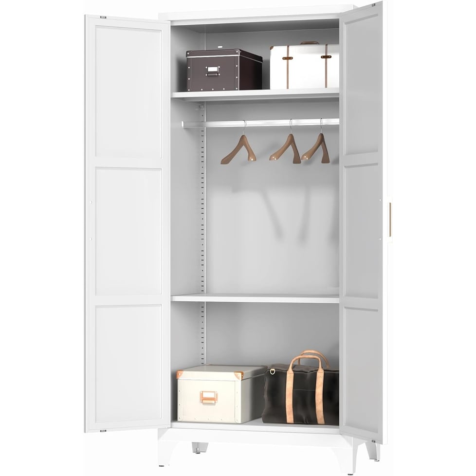 71 Inch White Metal Wardrobe Cabinet with Hanging Rod, 2 Doors, Adjustable Shelves, Assembly Required