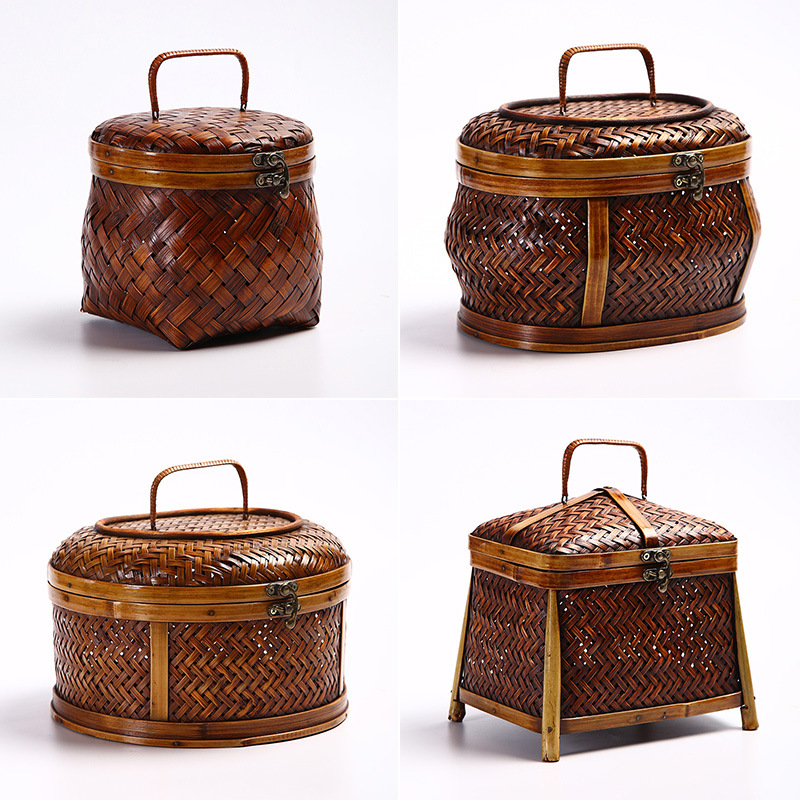 Antique Tea Set Organizer, Handmade Vintage Bamboo Woven Storage Box With Lid, Cosmetic Jewelry Decorative Trunk a