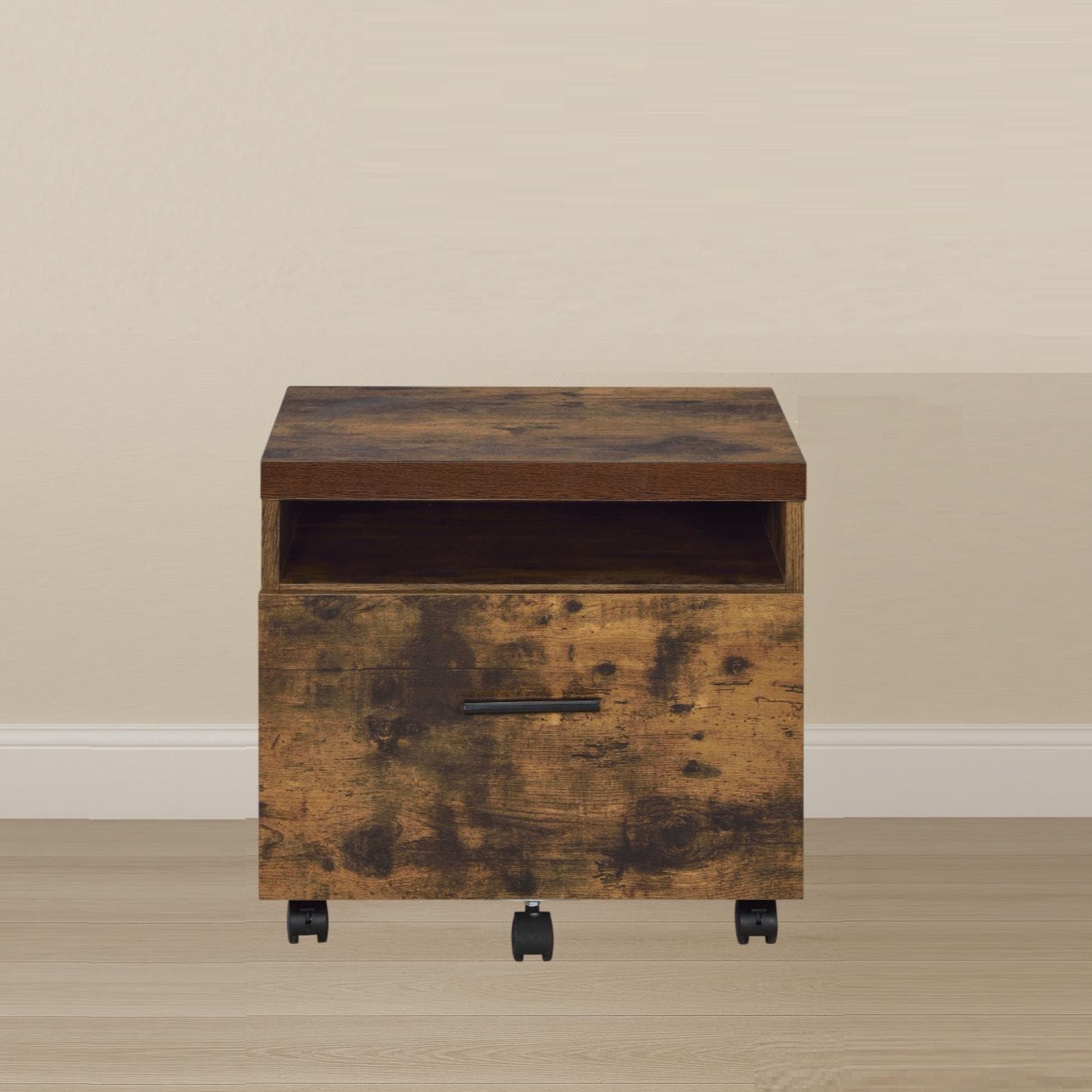 Industrial Style 1pc File Cabinet with Drawer and Shelf Caster Wheels, Wooden Weathered Oak Finish