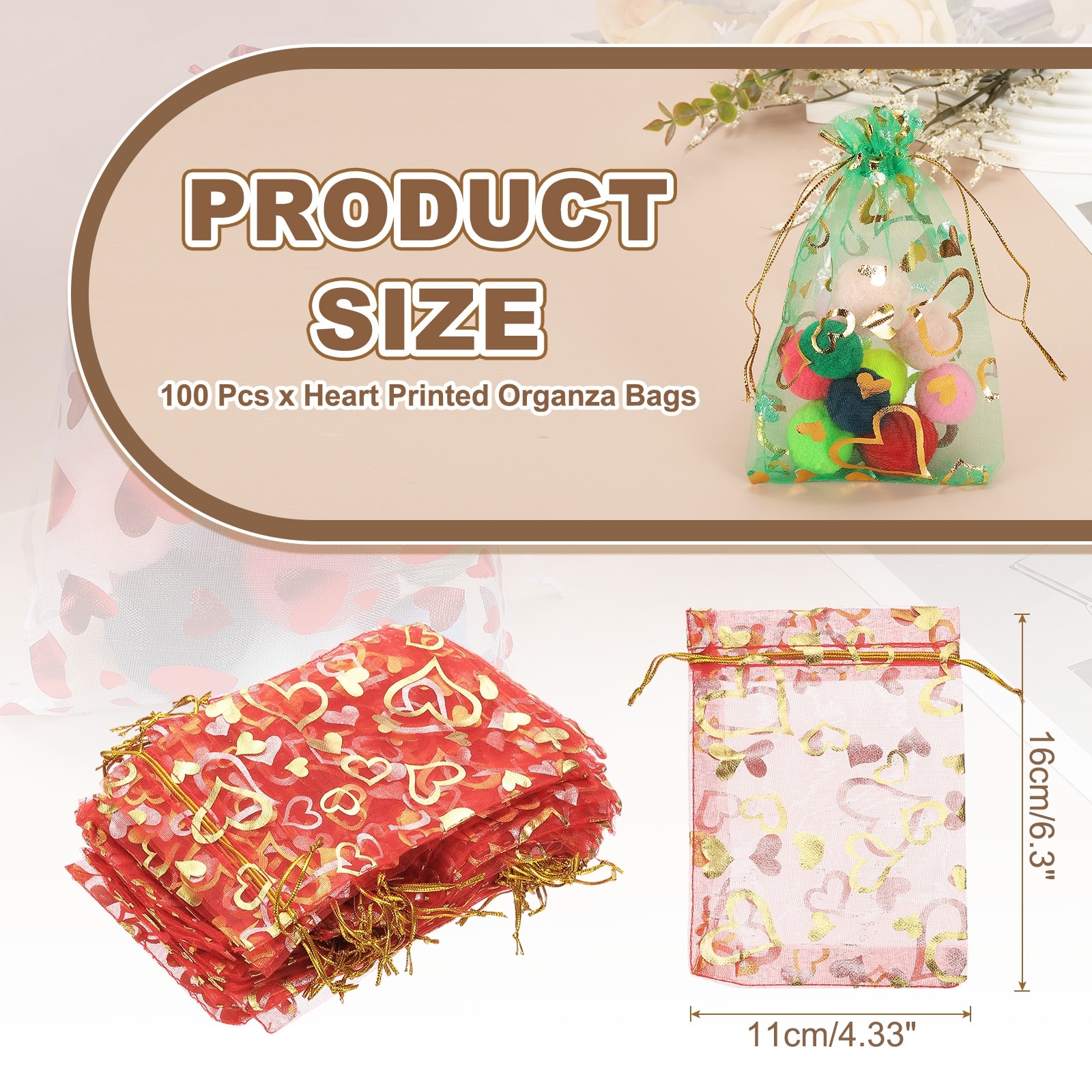 Heart Printed Organza Bags, Sheer Heart Organza Bags with Drawstring for Christmas Candy Jewelry Party Wedding Favor Gift