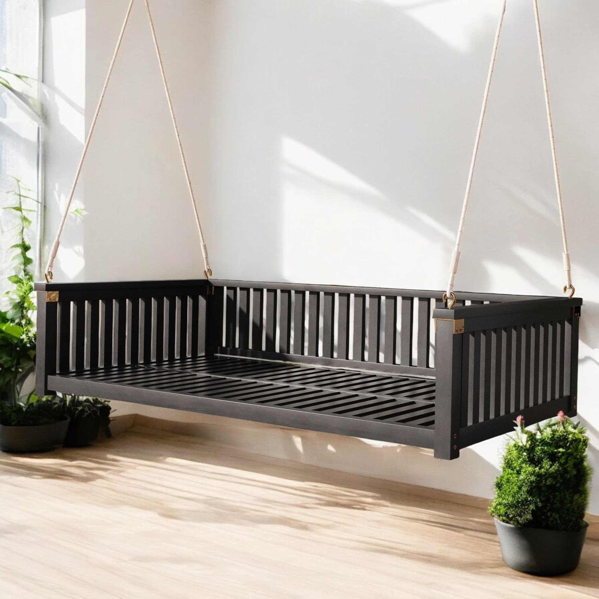 Premium Acacia Wood Patio Swing Bed with Ropes - Comfortable Outdoor Twin-Size Swing for Garden, Porch, or Backyard