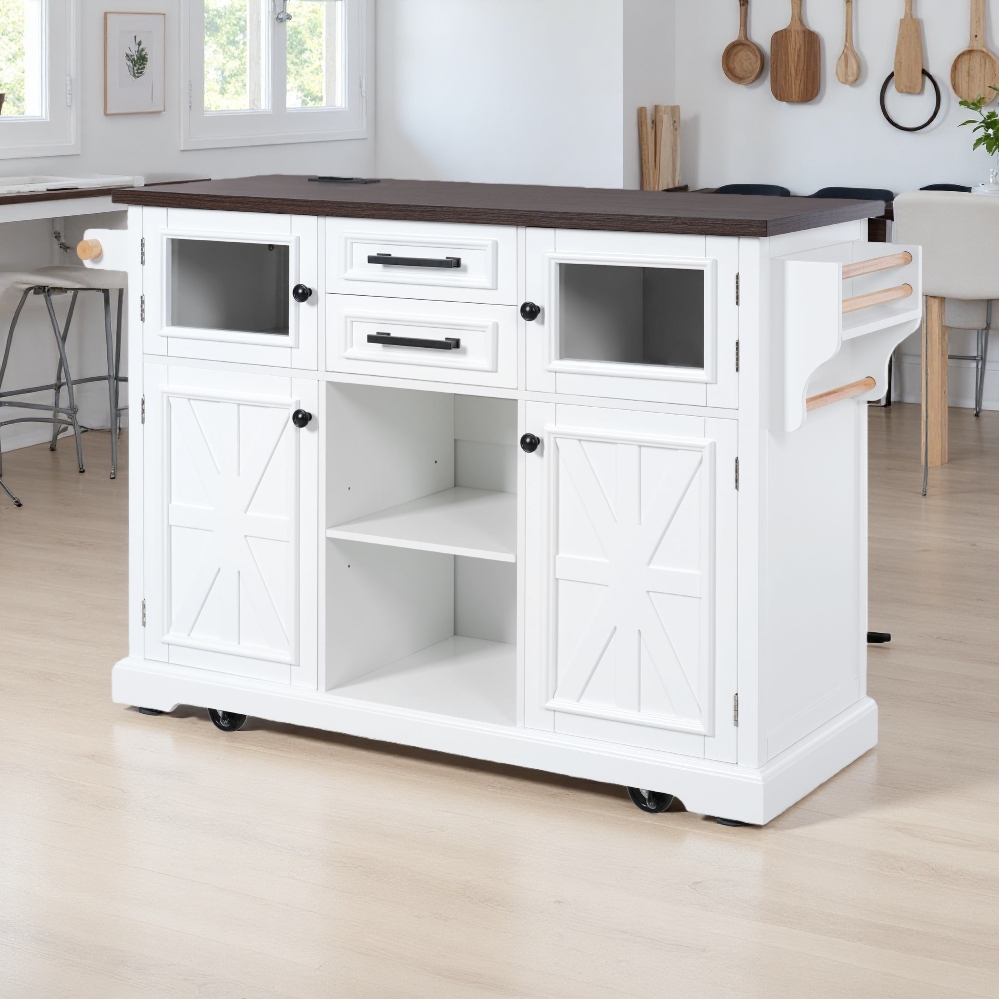 Kitchen Cart with Power Outlet, 2 Sliding Barn Door and Drop Leaf