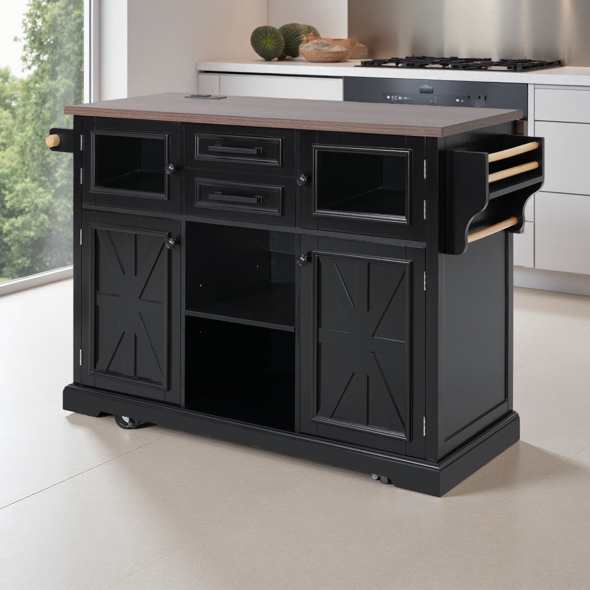 49.02'' Rubber Wood Farmhouse Kitchen Island with Rolling Wheels, Slide-Out Shelf, Towel Rack and Drawer