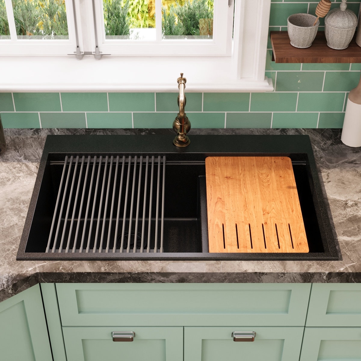 DeerValley 33" x 22" Black Undermount Drop in Quartz Double Bowl Kitchen Sink with Accessories DV-1K0171