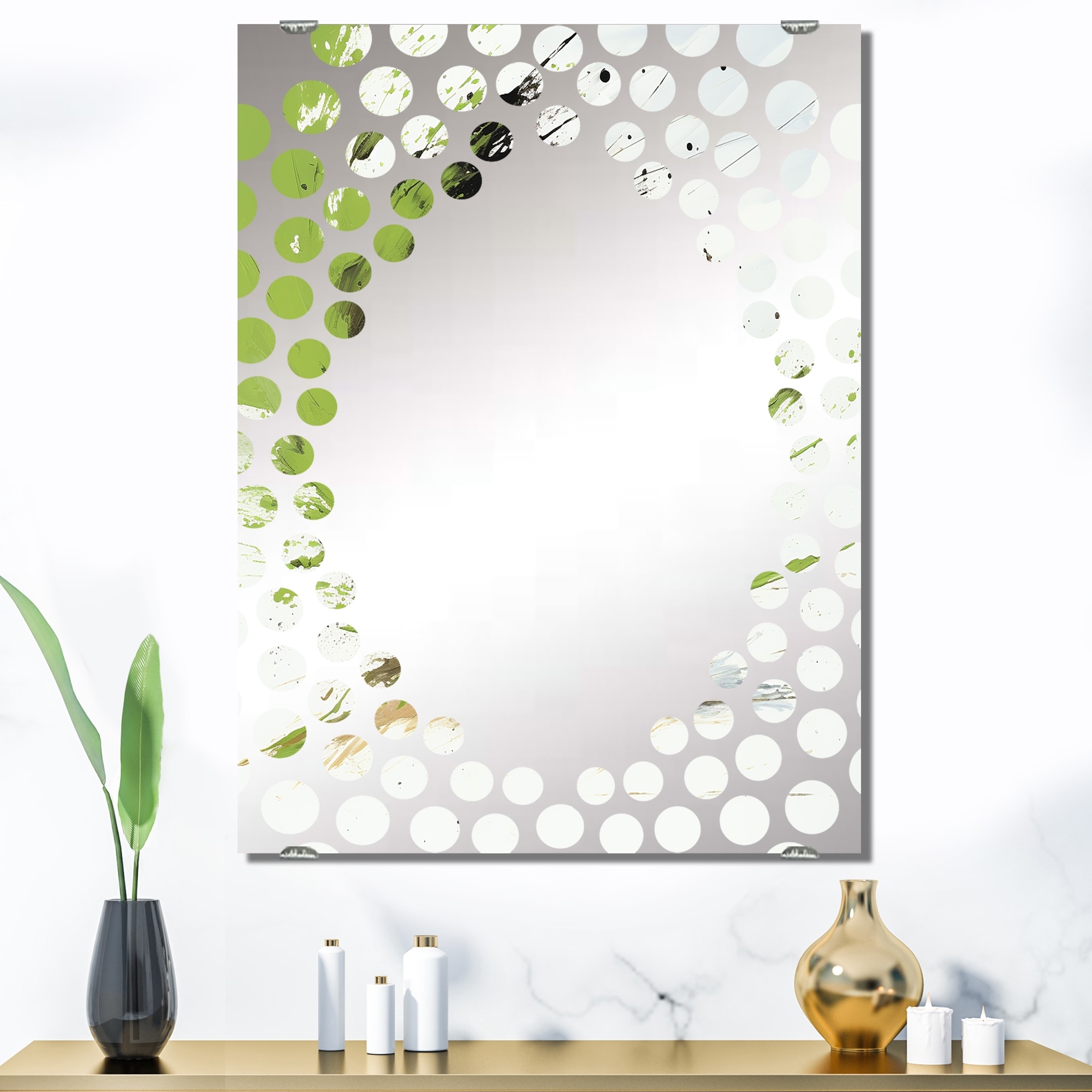 Designart "Green And White Abstract Spiral Collage II" Abstract Collages Mirror Modern Large Wall Mirror For Bathroom